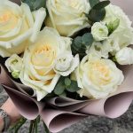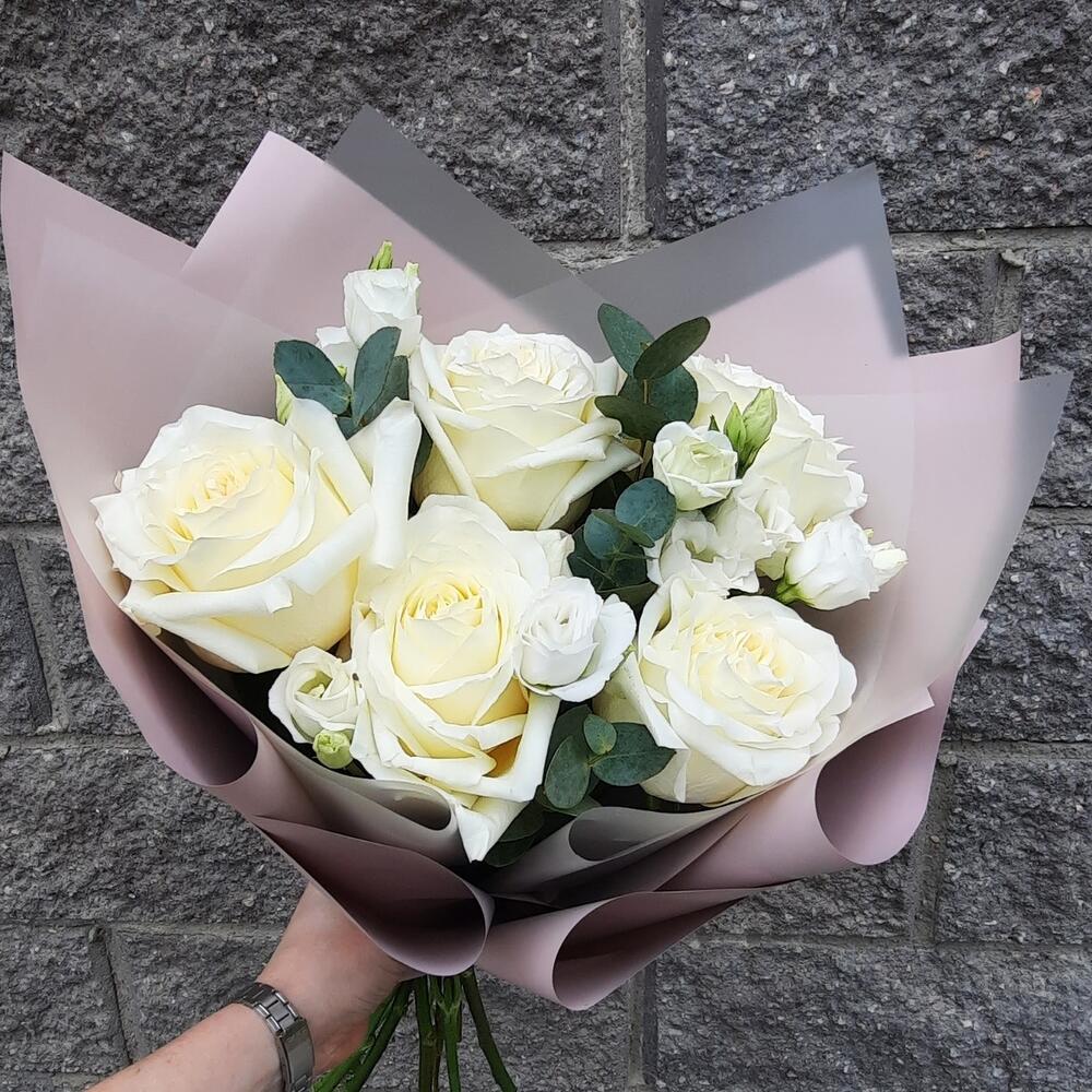 роза кендилайт – 5 шт.эустома белая – 2 шт.Эвкалипт – 1 шт.Упаковка – 1 шт.