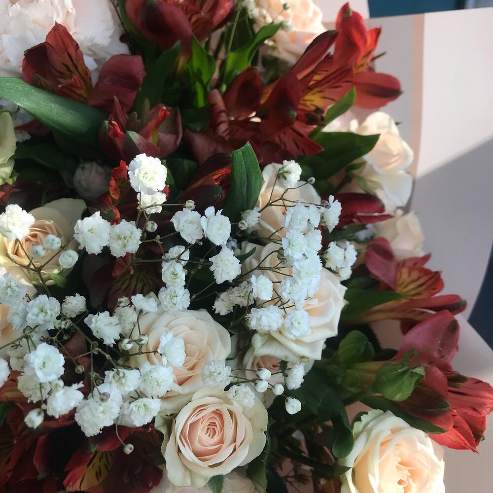 Кустовая роза – 4 шт.Гипсофила – 3 шт.Альстромерия – 9 шт.