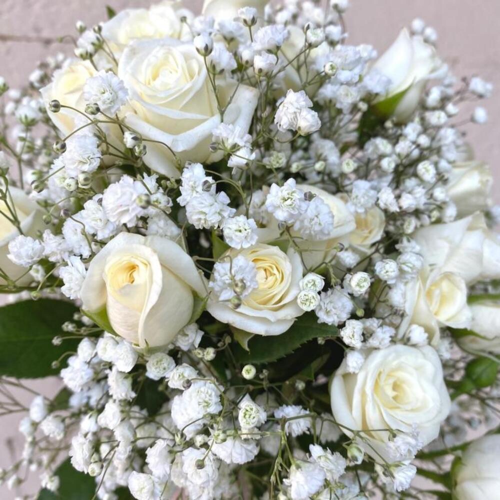 Роза кустовая – 5 шт.Гипсофила – 3 шт.Лента атласная – 1 шт.