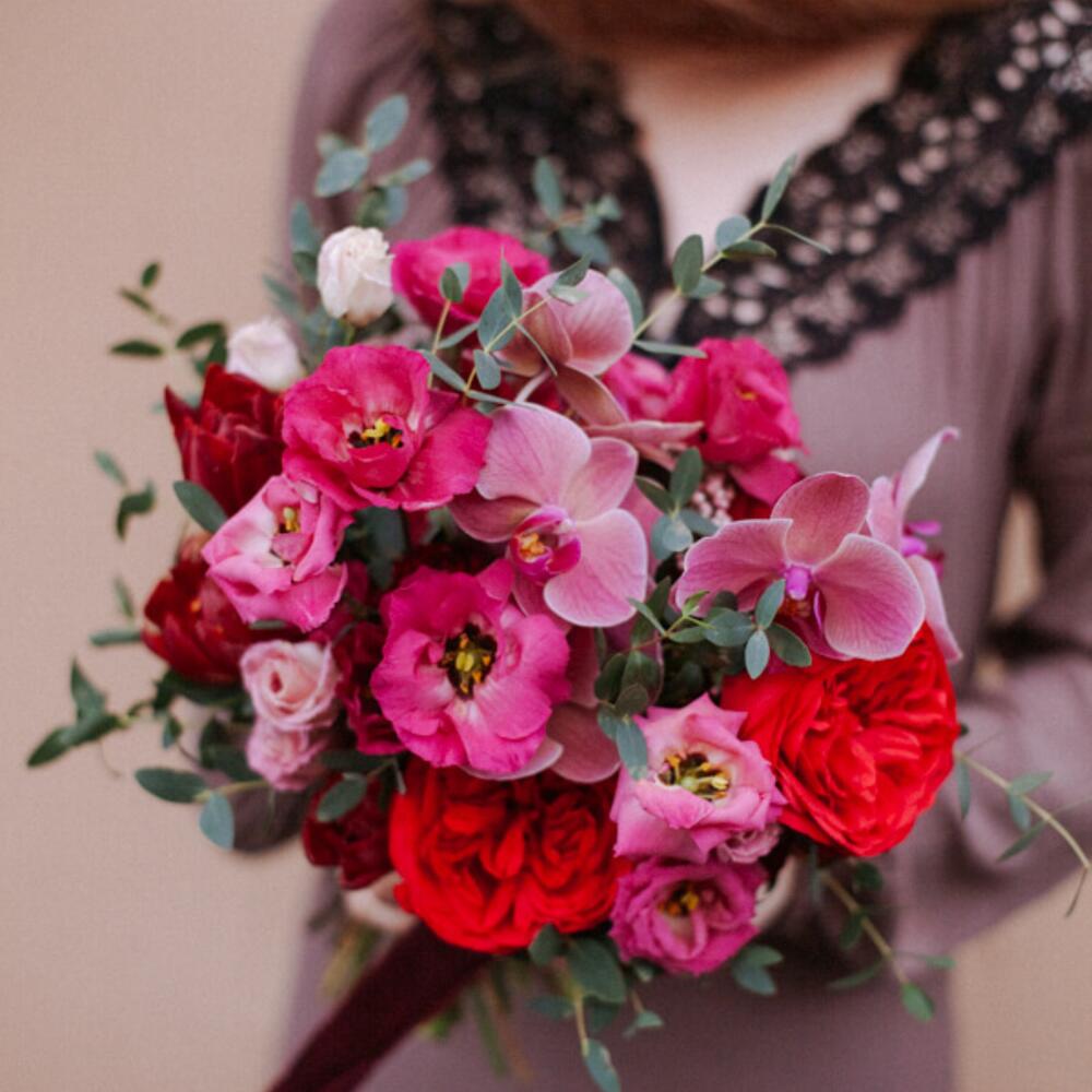 орхидея – 1 шт.пионовидные розы – 5 шт.Лизиантус – 5 шт.Кустовая роза – 5 шт.Эвкалипт – 3 шт.