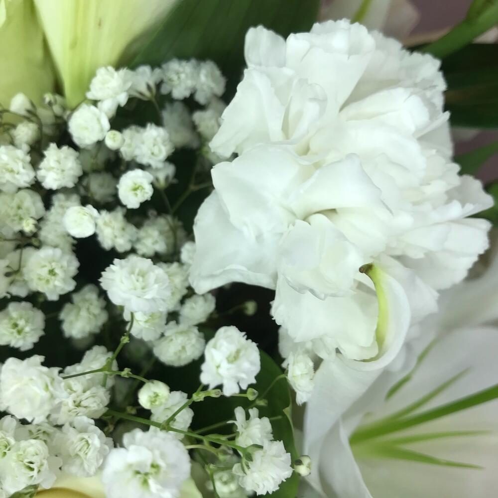 Лилия белая – 1 шт.Роза – 3 шт.Диантус – 5 шт.Гипсофила – 2 шт.Упаковка дизайнерская – 2 шт.
