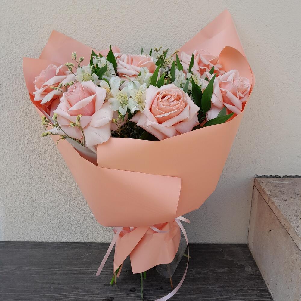 Альстромерия – 6 шт.Лимониум – 3 шт.Лента атласная – 2 шт.Упаковка дизайнерская – 3 шт.Роза французская – 7 шт.