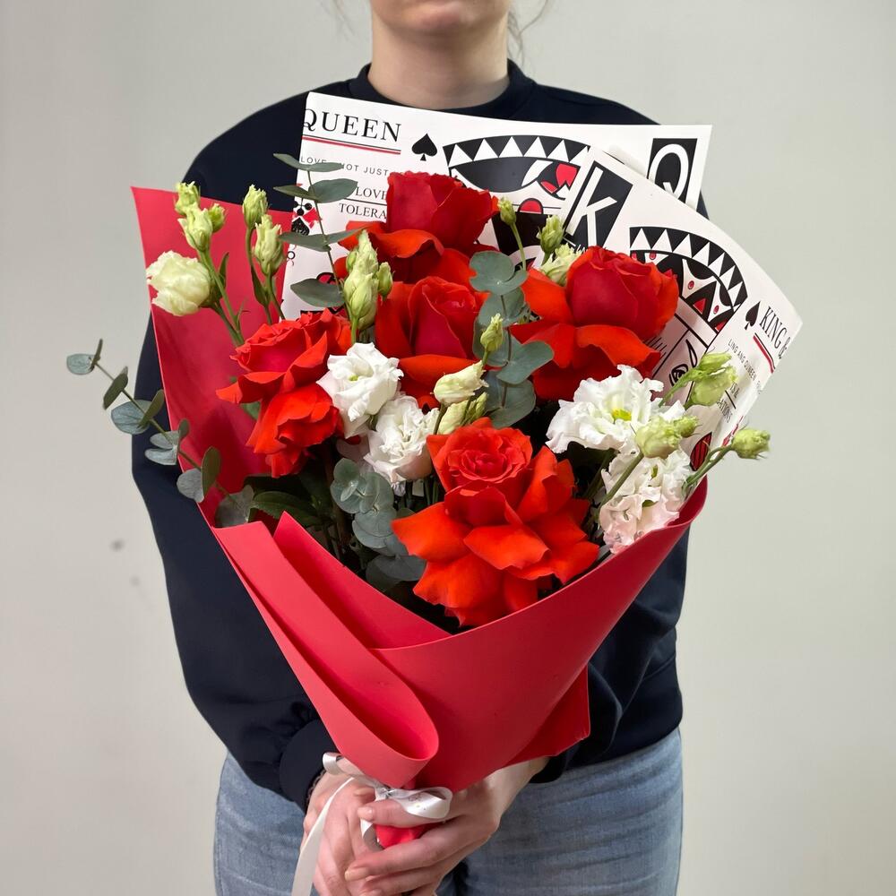 Роза Эквадор – 5 шт.Лизиантус Алиса белый – 4 шт.зелень декоративная – 1 шт.Упаковка дизайнерская – 1 шт.