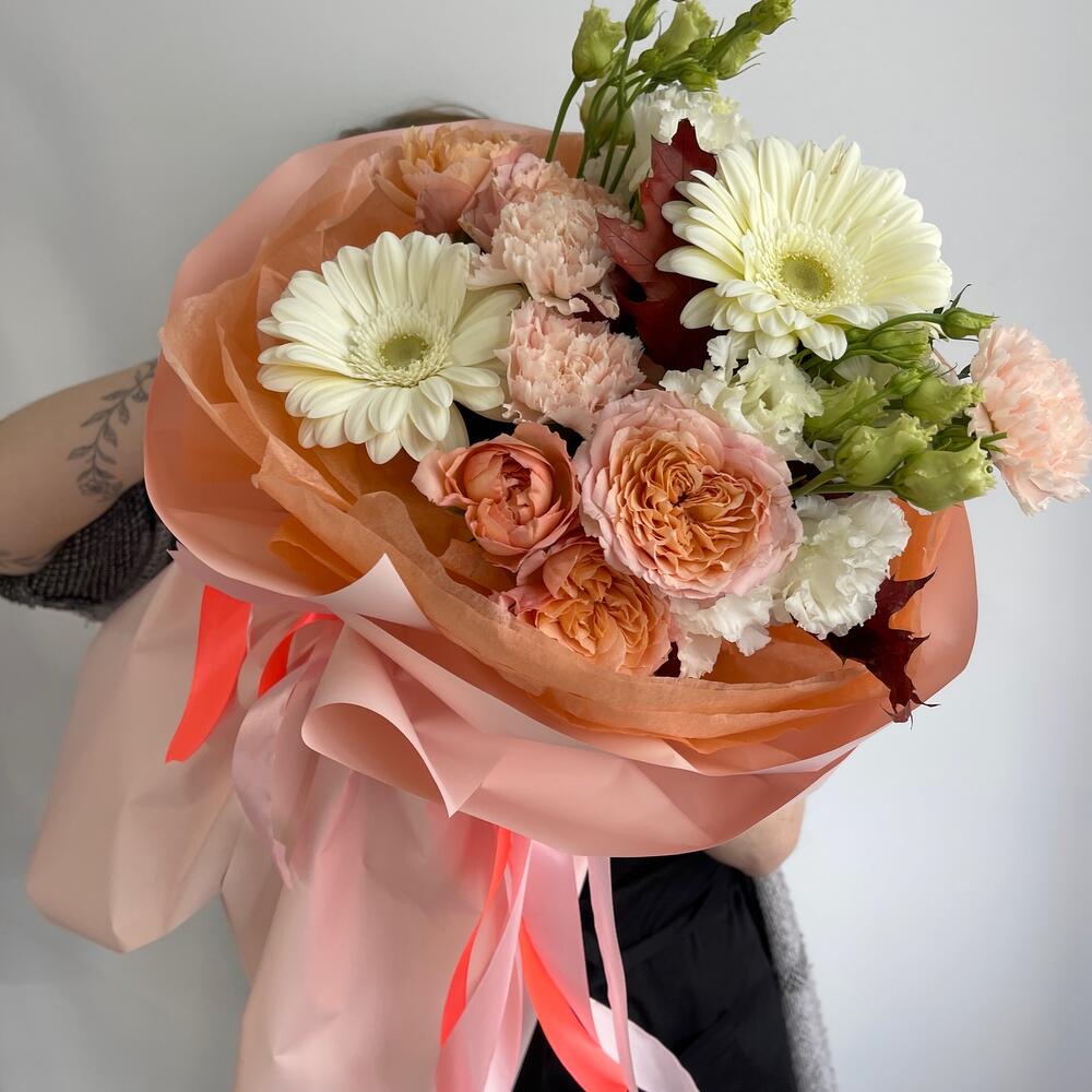 Салал – 2 шт.Эустома – 2 шт.Лента атласная – 2 шт.Гербера – 2 шт.Диантус – 3 шт.Упаковка дизайнерская – 2 шт.Листья Дуба – 1 шт.джульетта кустовая роза пионовидная – 2 шт.