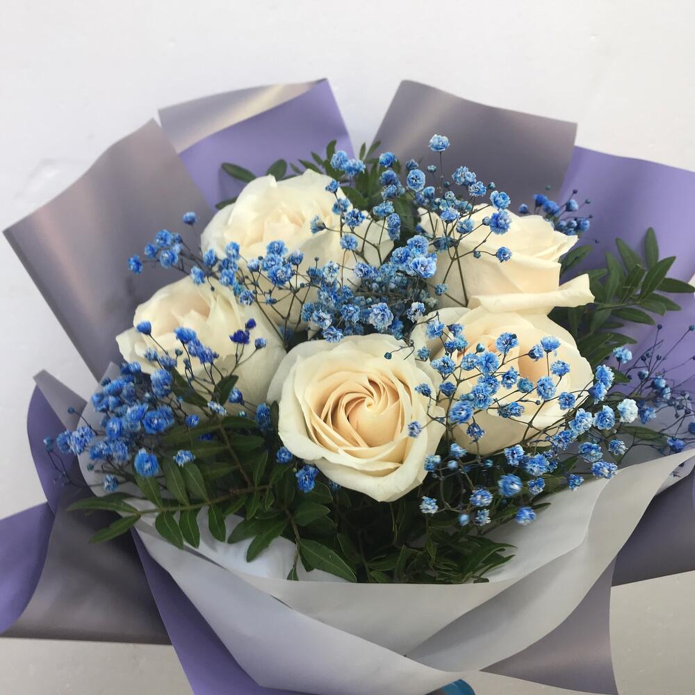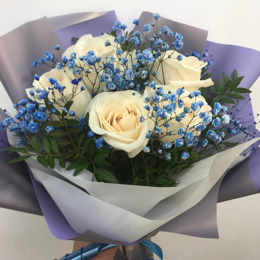 Роза белая 50 см – 5 шт.Гипсофила голубая – 2 шт.Фисташка – 5 шт.Упаковка дизайнерская – 1 шт.
