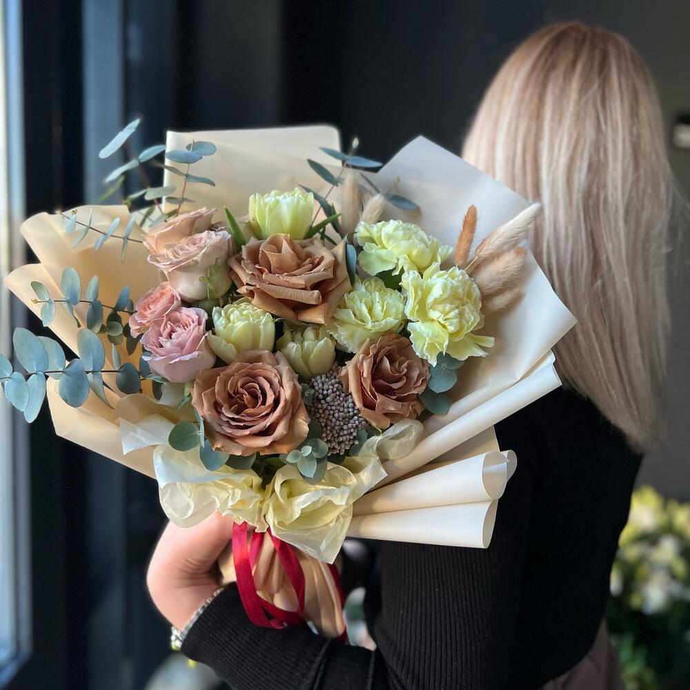 роза тоффи – 3 шт.Диантус – 3 шт.Роза кустовая – 2 шт.Тюльпан пионовидный – 3 шт.Лагурус – 7 шт.озатомус – 1 шт.Эвкалипт – 2 шт.Упаковка дизайнерская – 2 шт.Лента атласная – 1 шт.