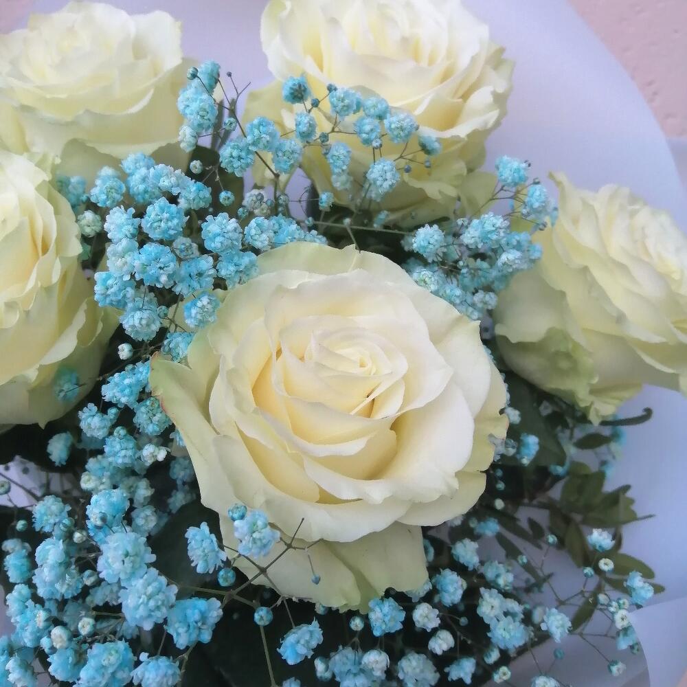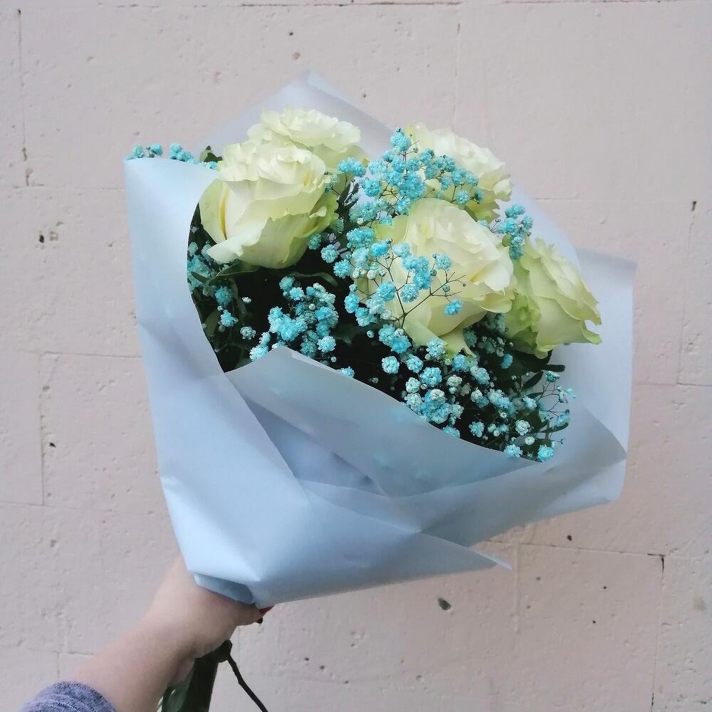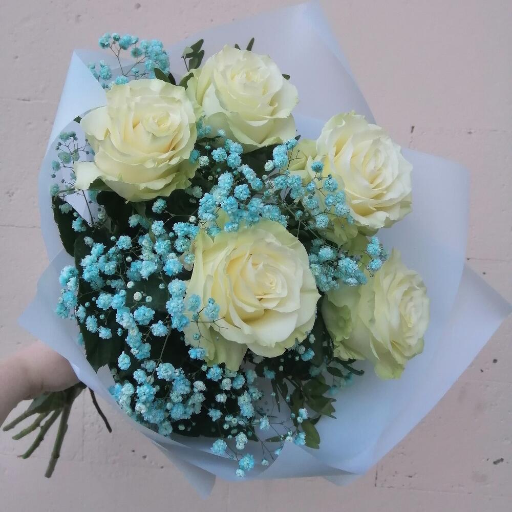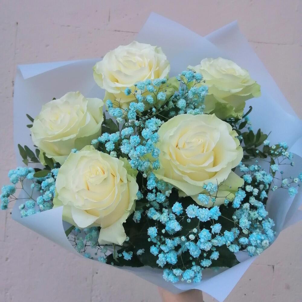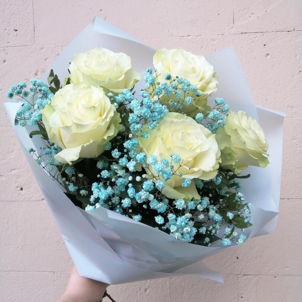 Лента – 1 шт.Роза Эквадор – 5 шт.Упаковка – 2 шт.Гипсофила голубая – 1 шт.зелень декоративная – 1 шт.