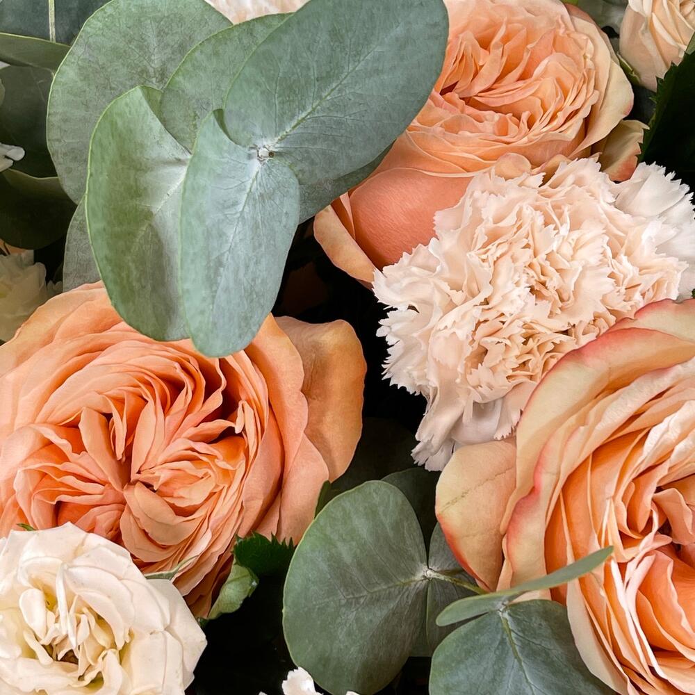 Букет с розами и лизиантусами "Персиковый джем"