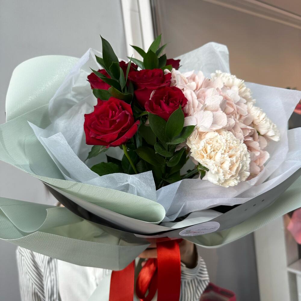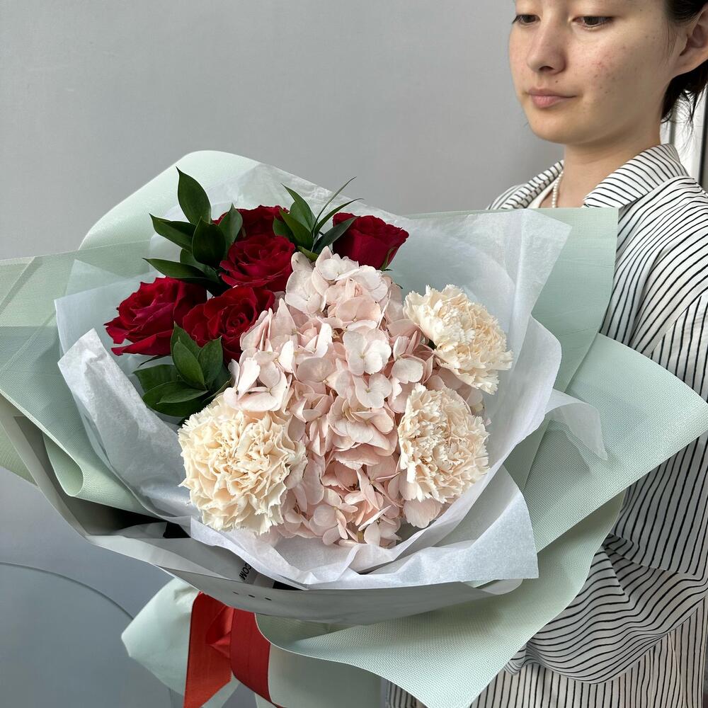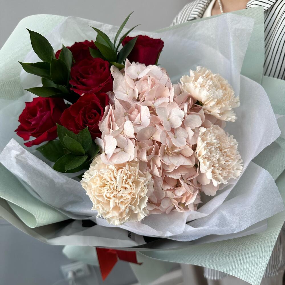 Гвоздики, Кустовые розы, Пионовидные розы, Розы
