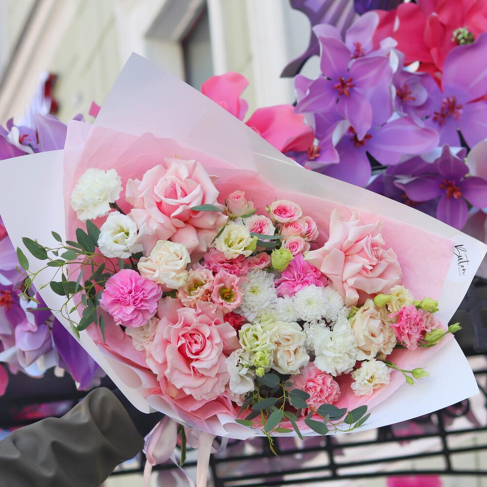 Категорий: Гвоздики, Кустовые розы, Лизиантусы, Пионовидные розы, Розы, Хризантемы