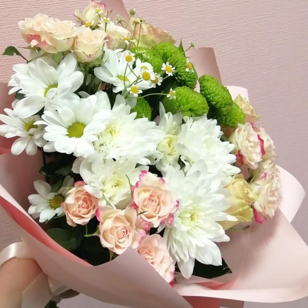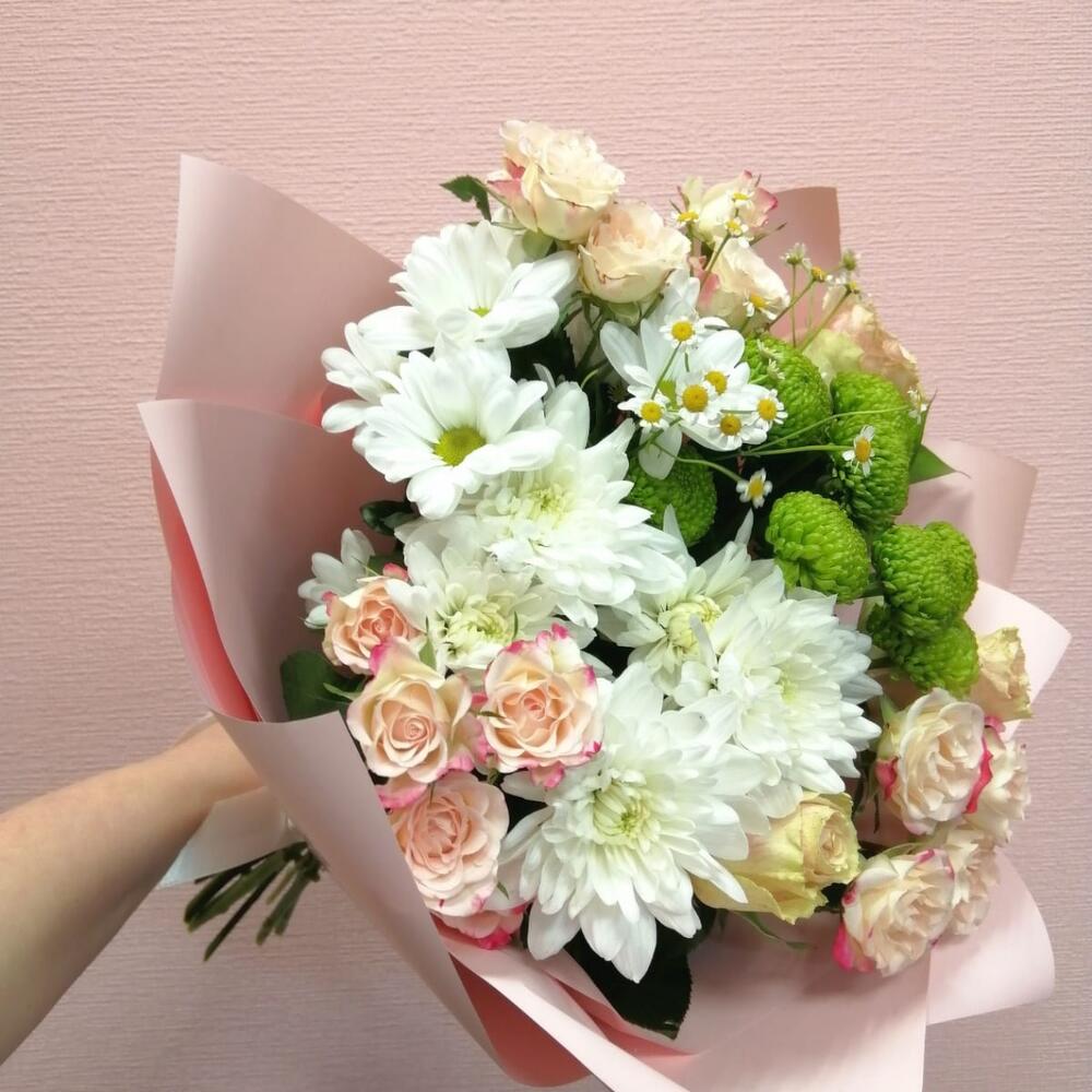 Лента – 1 шт.Роза кустовая – 3 шт.Хризантема кустовая – 3 шт.Роза – 3 шт.Упаковка – 1 шт.Матрикария – 1 шт.Фисташка – 1 шт.