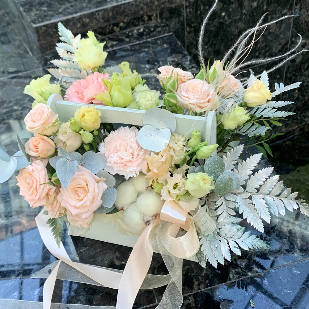 Лизиантус – 1 шт.Папоротник – 1 шт.Роза кустовая – 2 шт.Хлопок – 1 шт.Диантус – 2 шт.Ковыль – 1 шт.
