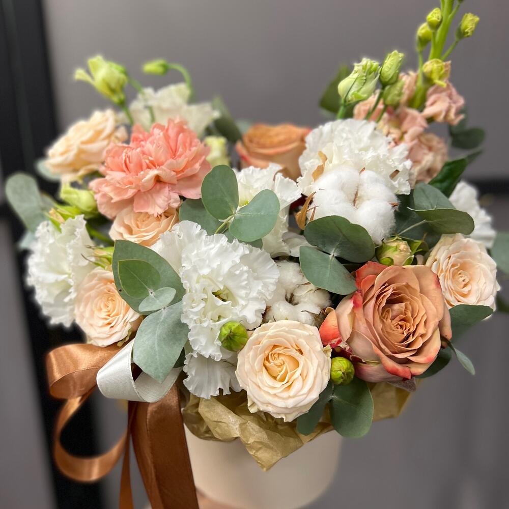 Роза Капучино – 2 шт.Хлопок – 2 шт.Эвкалипт – 2 шт.Лента атласная – 2 шт.Тишью – 1 шт.Диантус – 1 шт.Коробка шляпная – 1 шт.Оазис флористический – 1 шт.эустома махровая белая – 2 шт.Маттиола априкот – 1 шт.роза кустовая таня – 1 шт.
