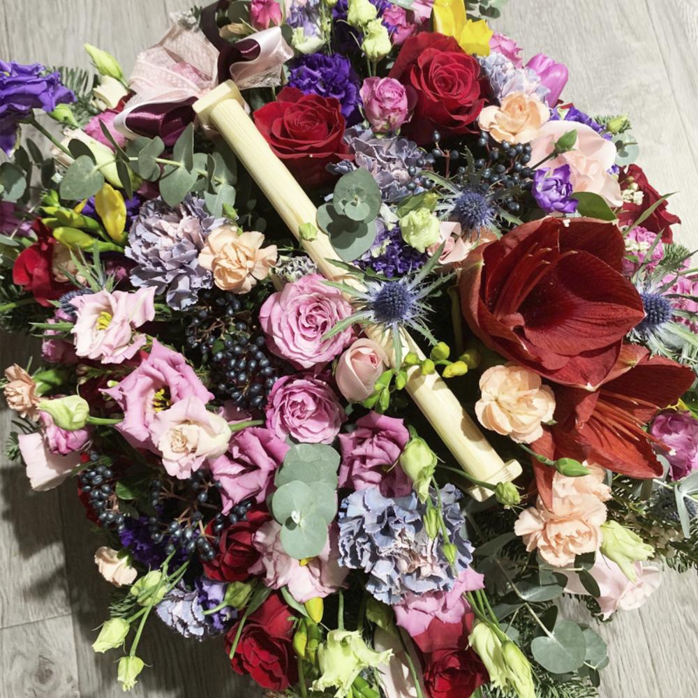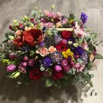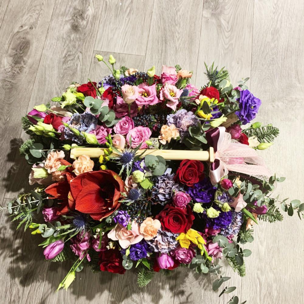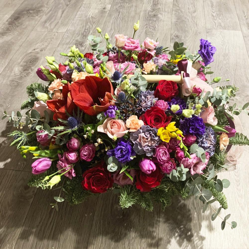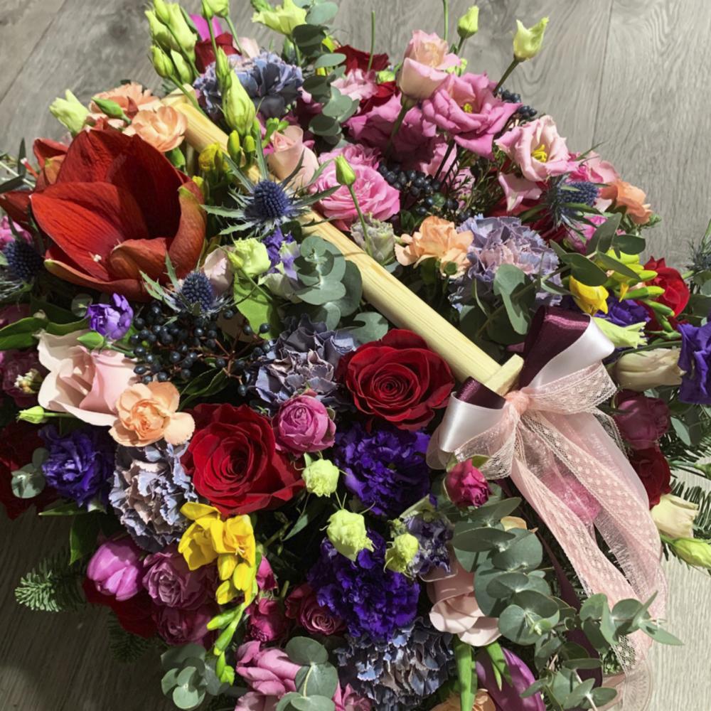 Яркая и объемная композиция с классическими розами цвета бордо, пионовидными кустовыми розами семейства “Бомбастик”, махровой нежно-розовой и фиолетовой эустомой, ягодами вибурнума, нежнейшими тюльпанами, диантусами, крупным амариллисом, пряной зеленью эвкалипта, составленная на оазисе в деревянном ящике ручной работы.Композиция буквально наполнена прекрасной энергетикой, в ней любовь красных роз и восхищение розовых кустовых роз, нежность диантусов и чистосердечная радость эустомы, пожелания успеха и процветания желтых фрезий.Эта невероятно чувственная композиция – прекрасный и действительно особенный подарок, который по достоинству оценят.