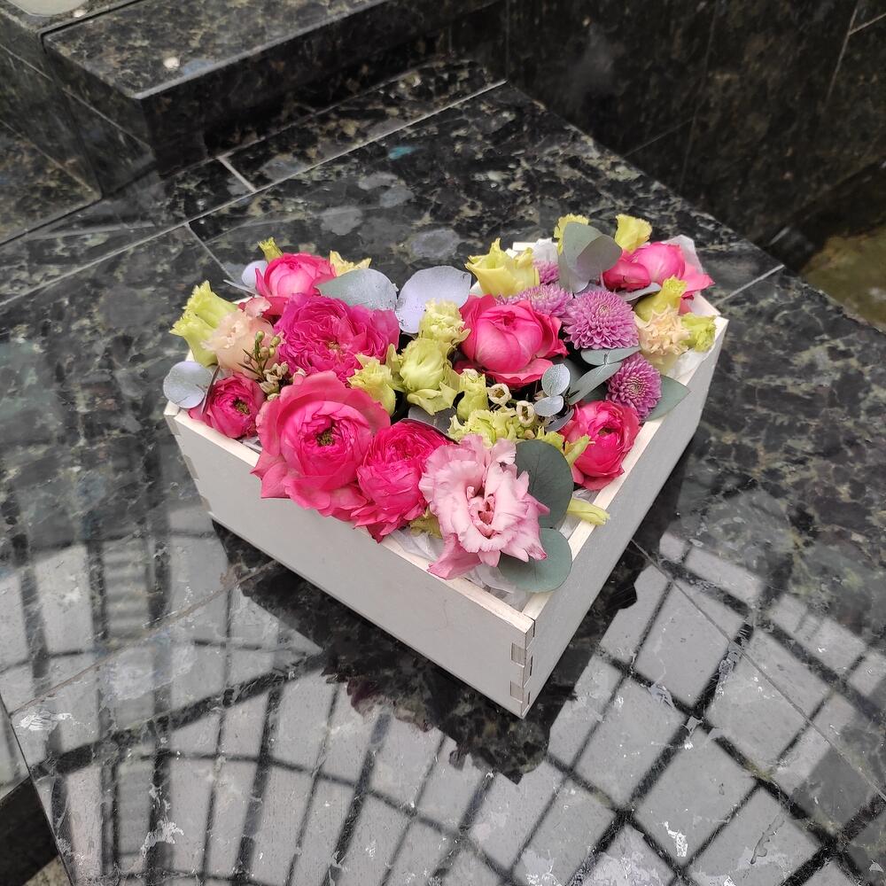 Роза кустовая пионовидная – 2 шт.Лизиантус – 2 шт.Хризантема кустовая – 1 шт.Ваксфлауэр – 1 шт.Эвкалипт – 1 шт.ящик сердце деревянный – 1 шт.