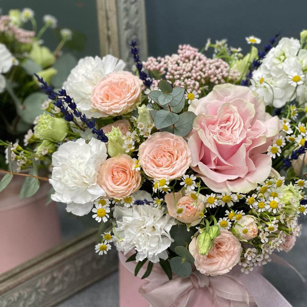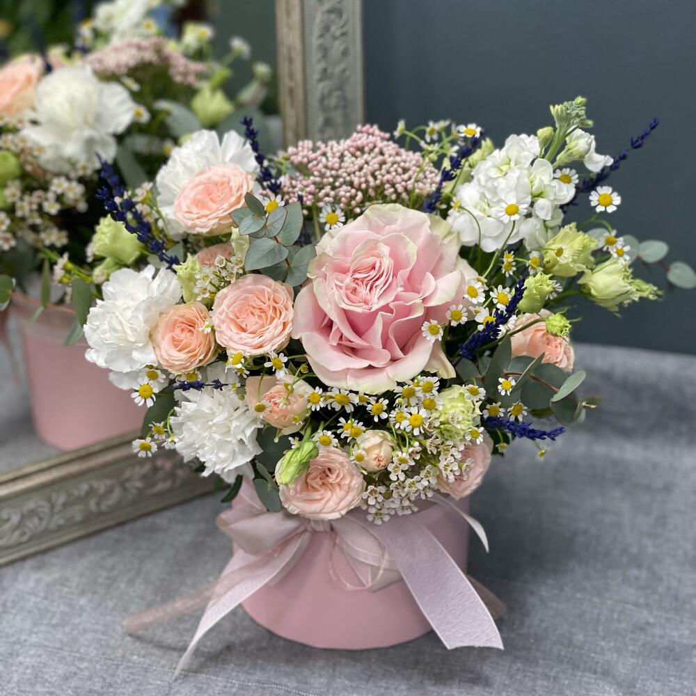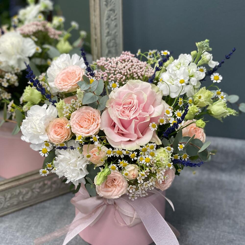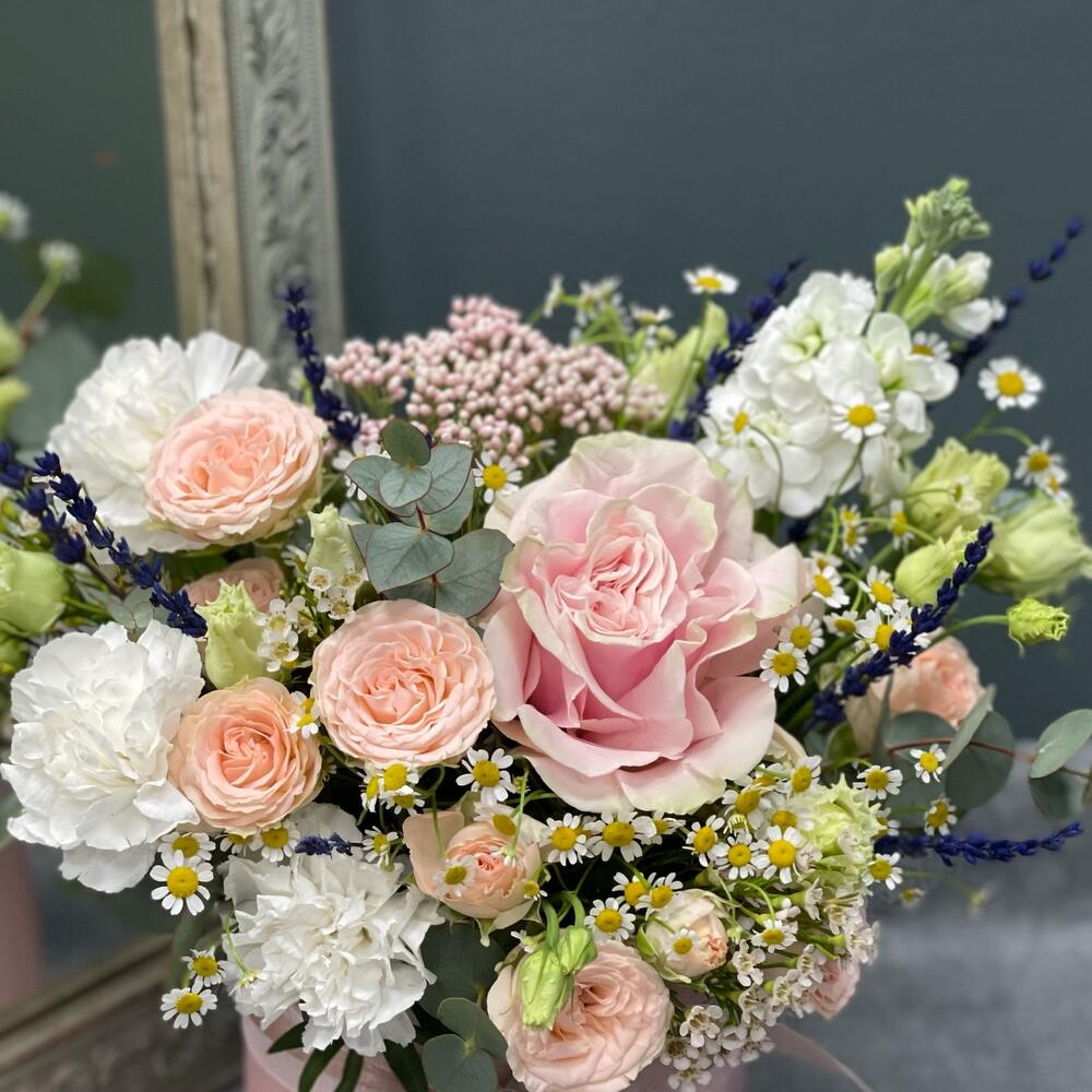 Цветочная композиция в шляпной коробке L «Утро в саду»