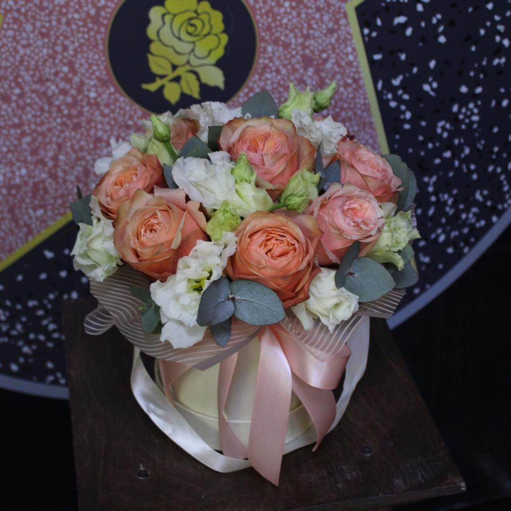 Роза пионовидная кахала – 9 шт.Эвкалипт – 3 шт.Пленка дизайнерская – 1 шт.Оазис флористический – 1 шт.Шляпная коробка – 1 шт.Лента атласная – 1 шт.эустома махровая – 3 шт.