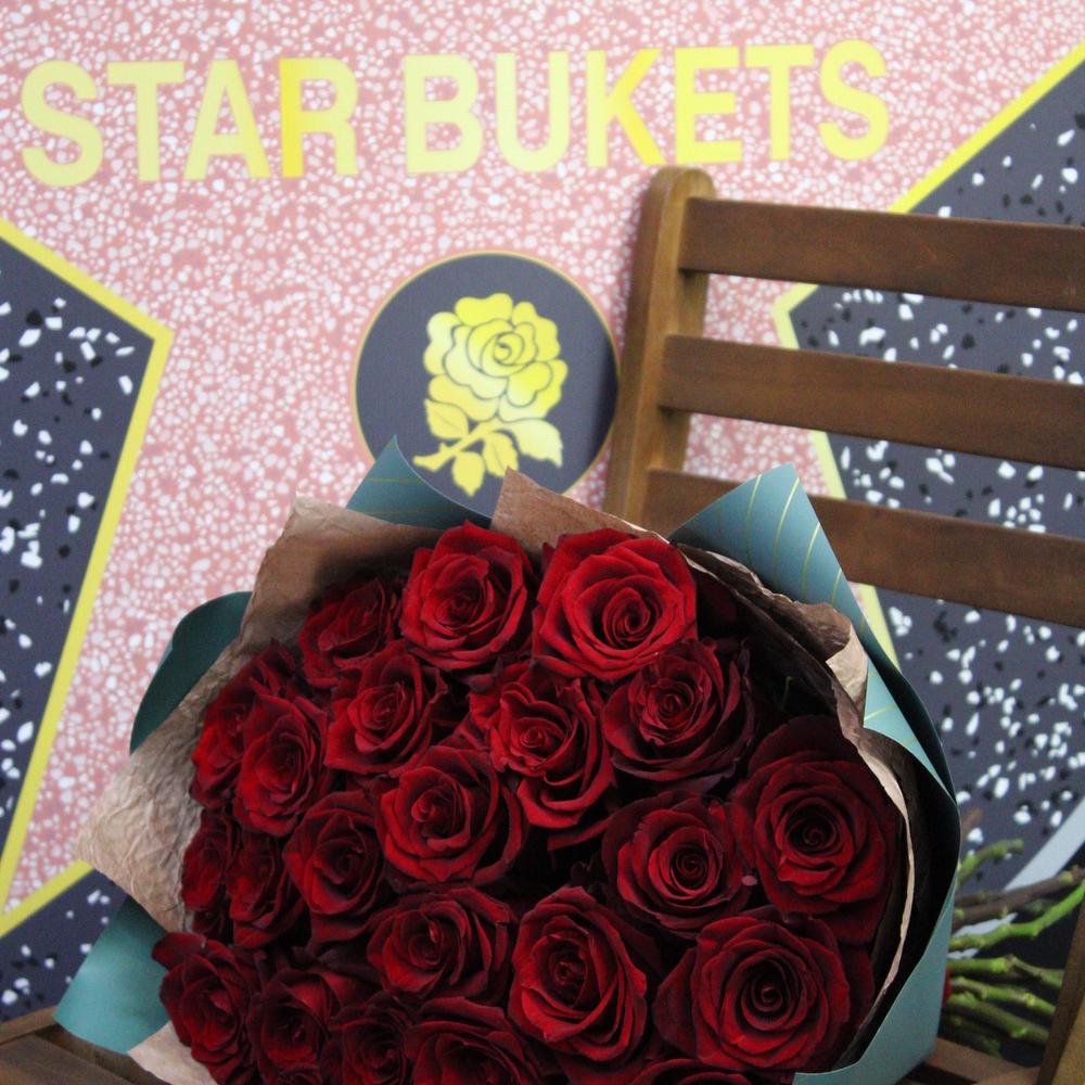 Лента атласная – 2 шт.Роза Эксплорер – 25 шт.Пленка матовая – 2 шт.Крафт жатый – 2 шт.