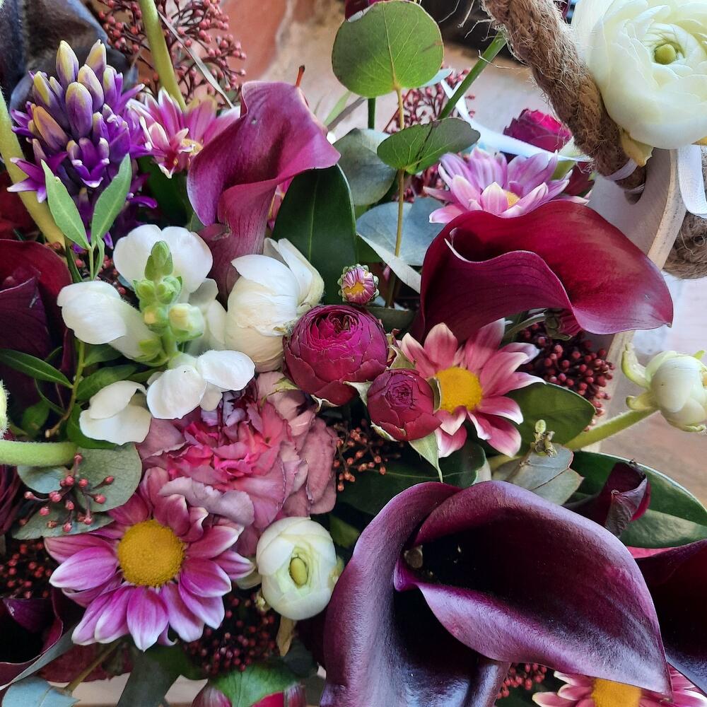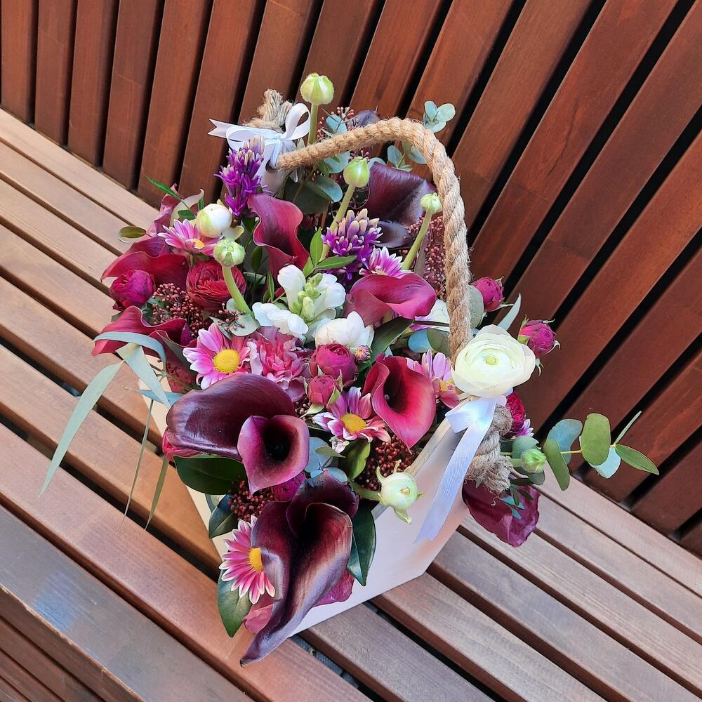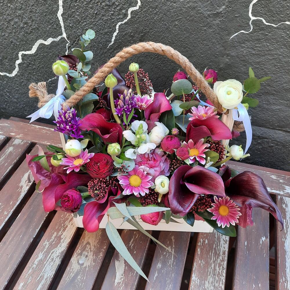 Ящик деревянный – 1 шт.Оазис флористический – 1 шт.Калла – 11 шт.Пион – 1 шт.Гиацинт – 1 шт.Гвоздика – 1 шт.Роза пионовидная кустовая – 1 шт.Скиммия – 1 шт.Антуриум – 1 шт.Эвкалипт – 1 шт.