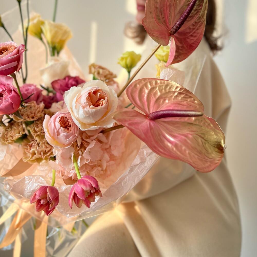 Гвоздики, Лизиантусы, Розы, Тюльпаны