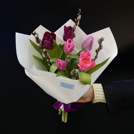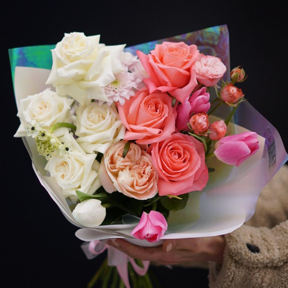 Роза цветная – 7 шт. Роза пионовидная – 1 шт. Кустовая роза – 2 шт. Тюльпан – 3 шт. Хризантема – 3 шт. Орнитогалум – 1 шт. Упаковка дизайнерская – 2 шт. Открыточка с вашими пожеланиями – 1 шт. инструкция по уходу за цветами – 1 шт.