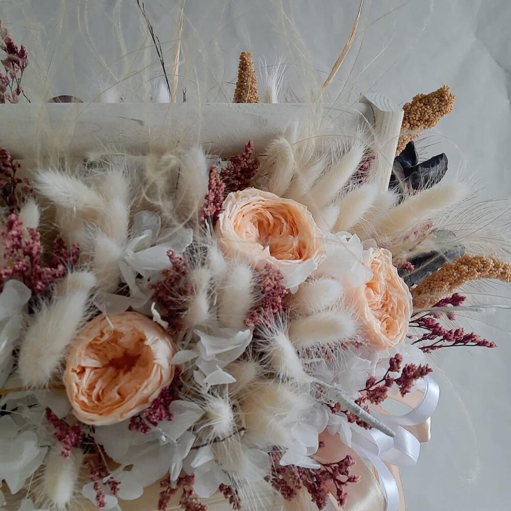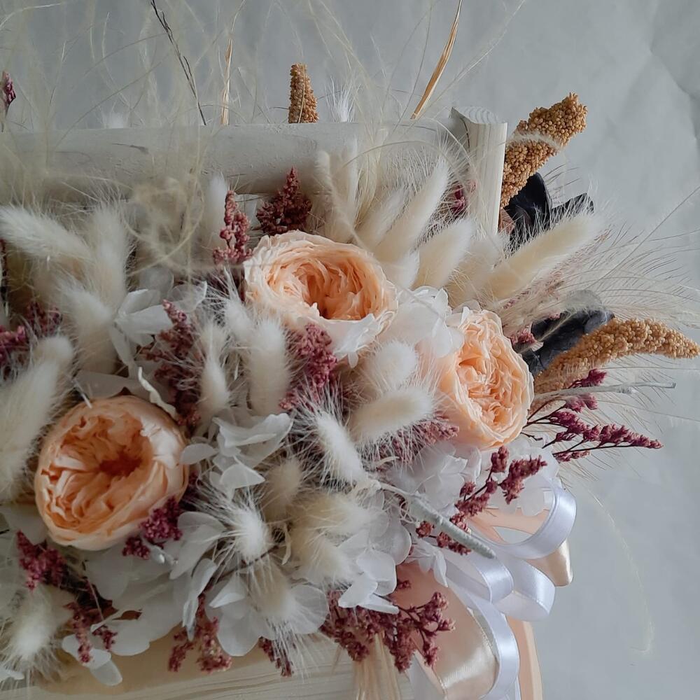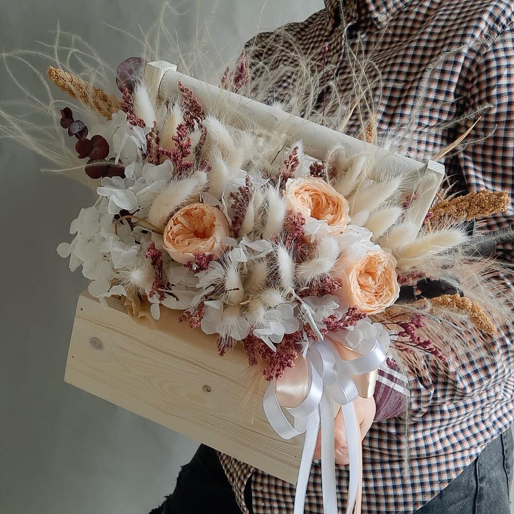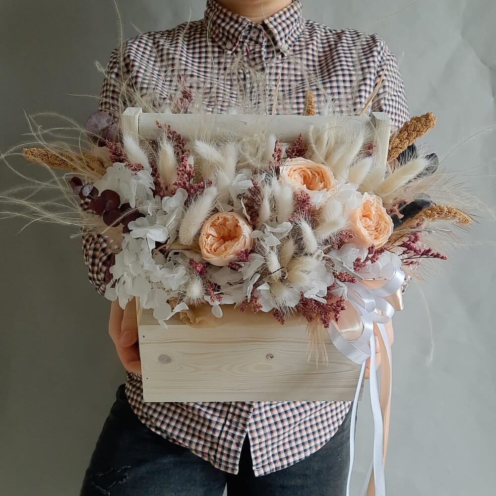 Лента атласная – 3 шт.Ящик деревянный – 1 шт.Оазис для сухоцветов – 1 шт.Эвкалипт стабилизированный – 4 шт.камыш декоративный – 4 шт.гортензия стабилизированная – 1 шт.ковыль связка – 4 шт.лагурус (сухоцвет) пучок – 3 шт.ветки декоративные – 10 шт.роза пионовидная стабилизированная – 3 шт.лимониум стабилизированный – 3 шт.