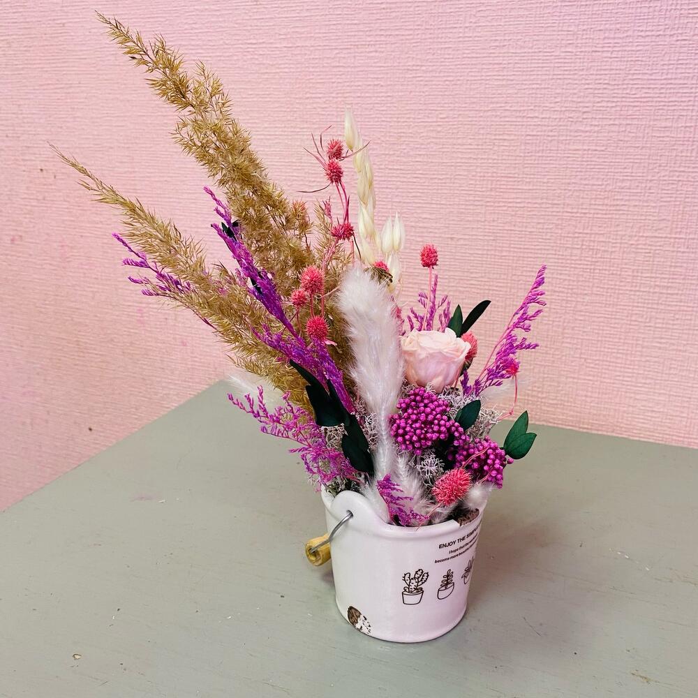 Эвкалипт – 1 шт.Роза стабилизированная – 1 шт.Кашпо керамическое – 1 шт.Мох натуральный – 1 шт.Оазис флористический – 1 шт.пампасная трава – 1 шт.овес сухоцвет – 1 шт.лимониум сухоцвет – 1 шт.эрингиум сухоцвет – 1 шт.озотамнус стабилизированный – 1 шт.