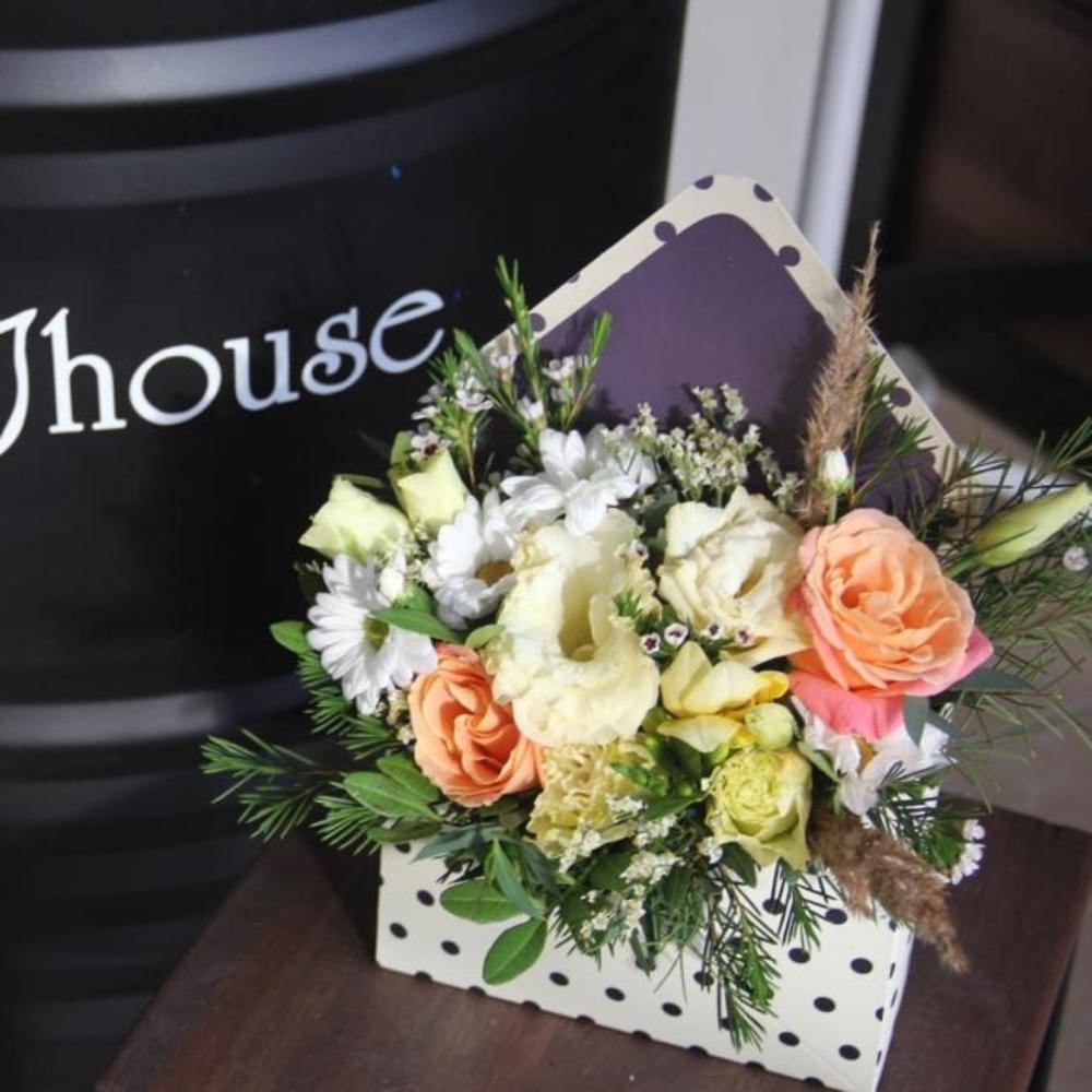Хризантема кустовая – 2 шт.Роза – 1 шт.Эустома – 2 шт.Фисташка пучок – 1 шт.Оазис флористический – 1 шт.конверт картонный – 1 шт.сухоцветы пучок – 2 шт.