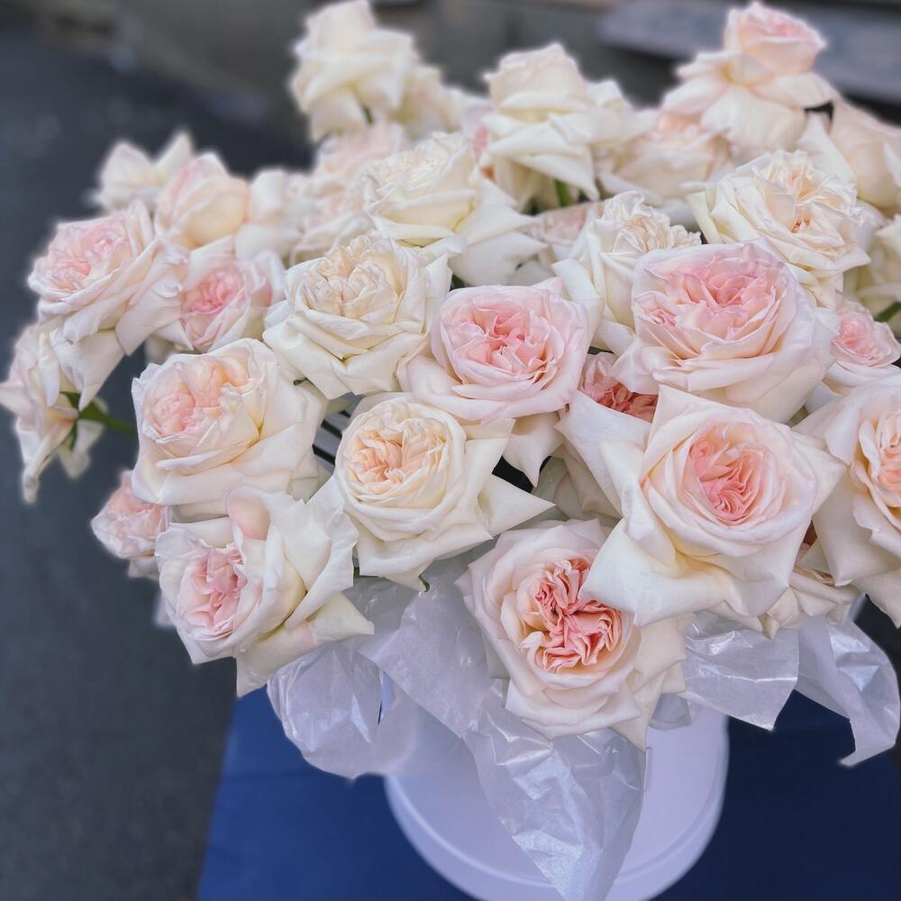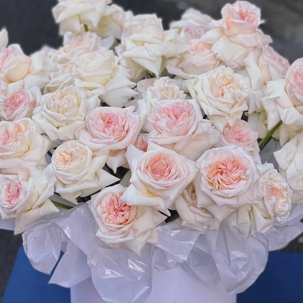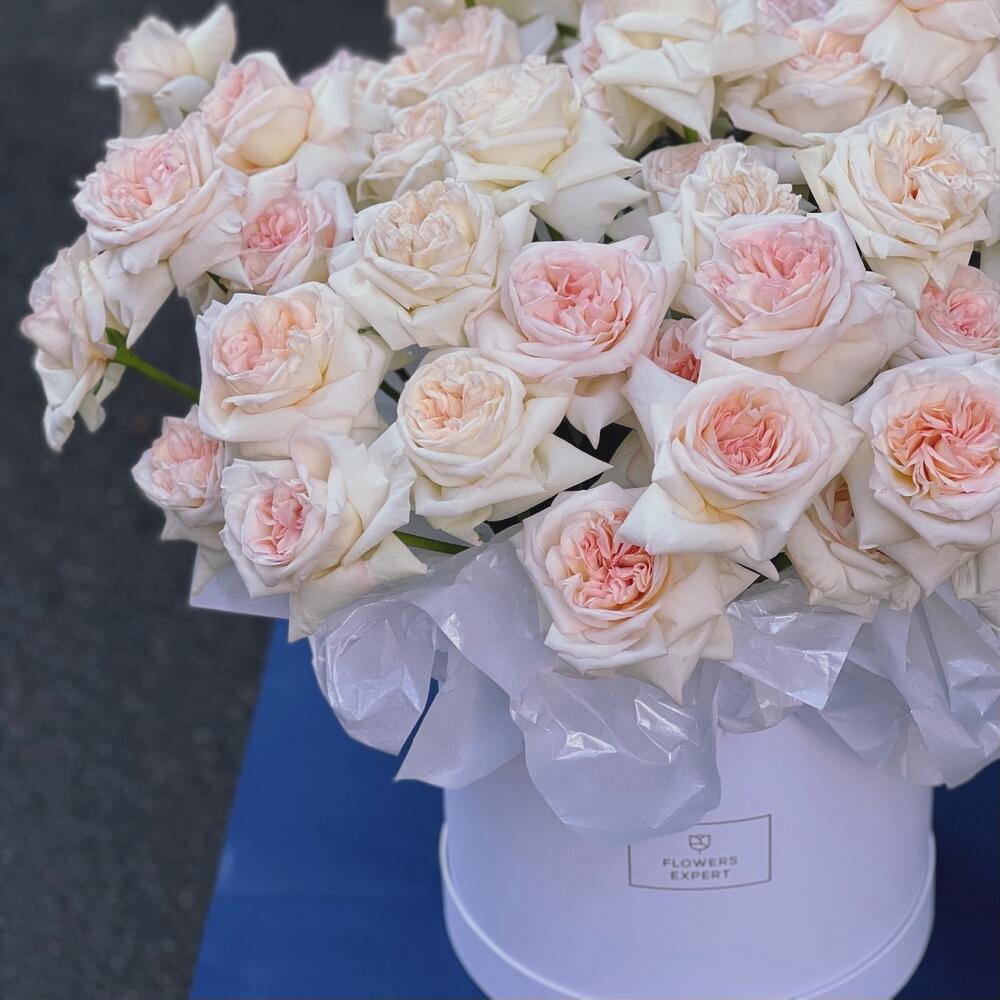 Композиция в шляпной коробке из 51 ароматной пионовидной розы