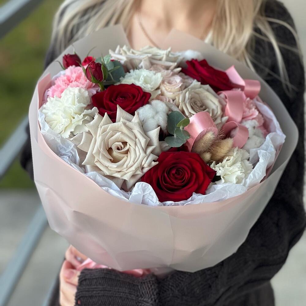 Категорий: Гвоздики, Кустовые розы, Пионовидные розы, Розы, Сухоцвет