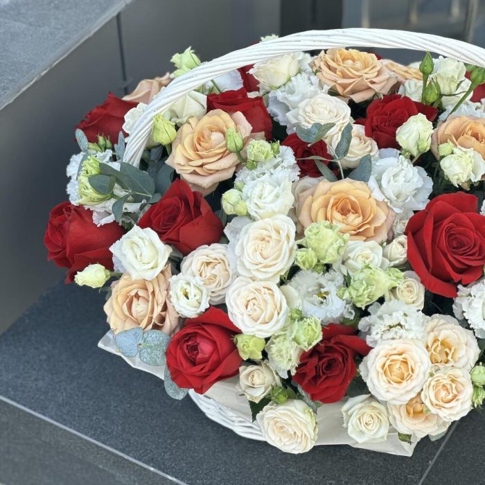 Корзина Прекрасная Иллюзия из роз сорта капучино, фридом, эустомы и кустовых роз