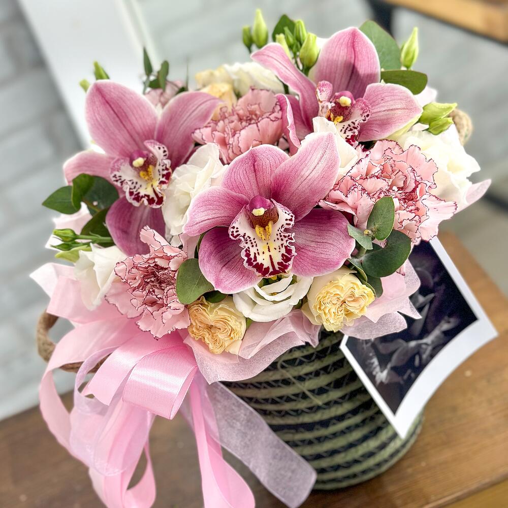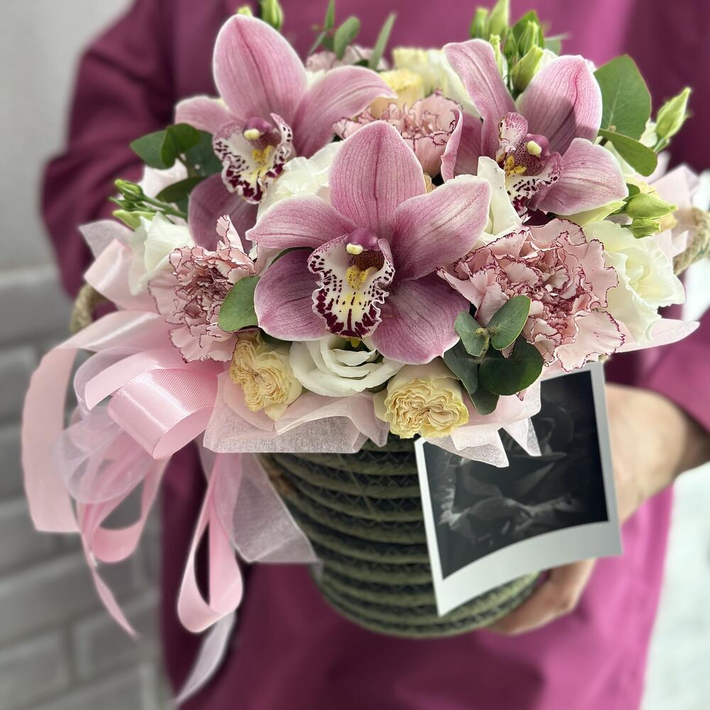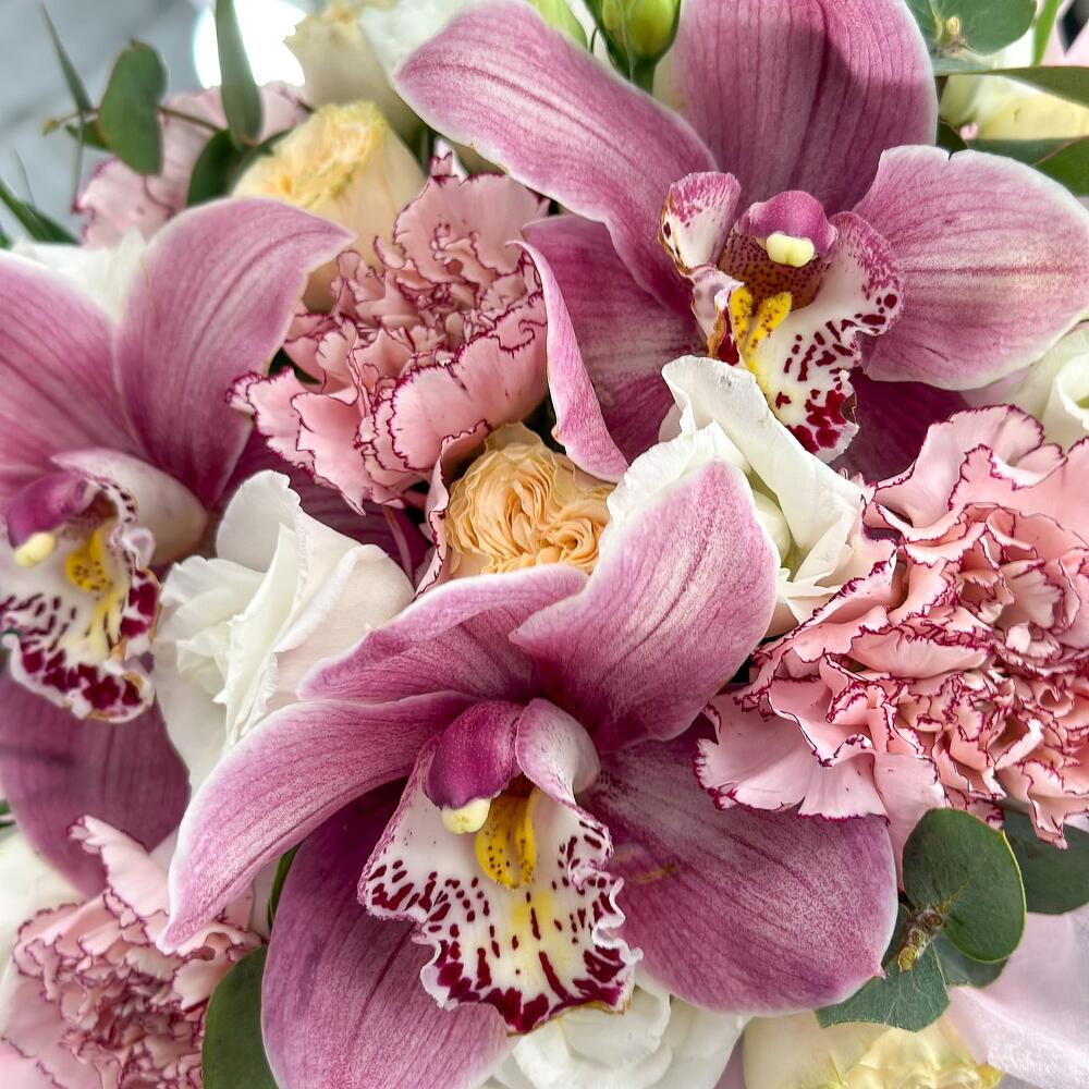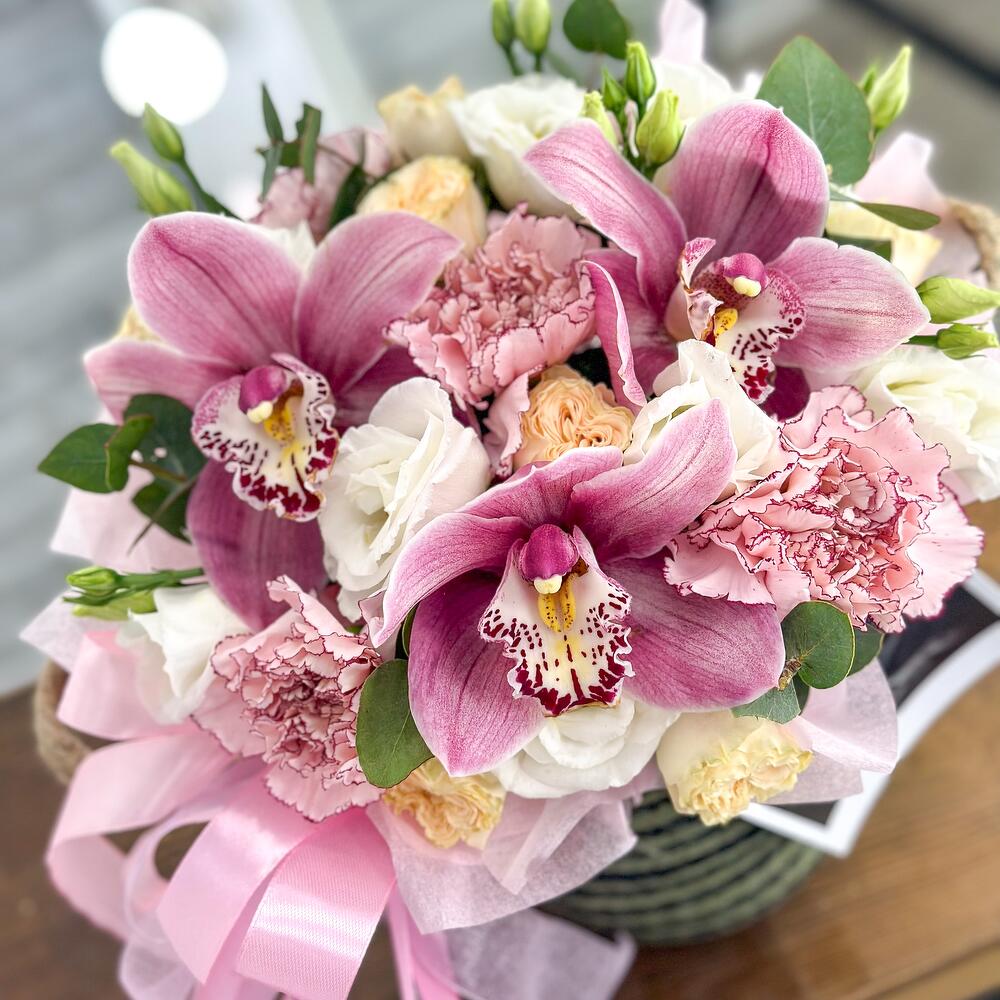Орхидея Цимбидиум – 3 шт.Эвкалипт – 1 шт.Кашпо плетеное – 1 шт.Открыточка с вашими пожеланиями – 1 шт.Оазис флористический – 1 шт.Диантус сортовой – 5 шт.роза садовая пионовидная – 3 шт.лизиантус махровый белый – 2 шт.