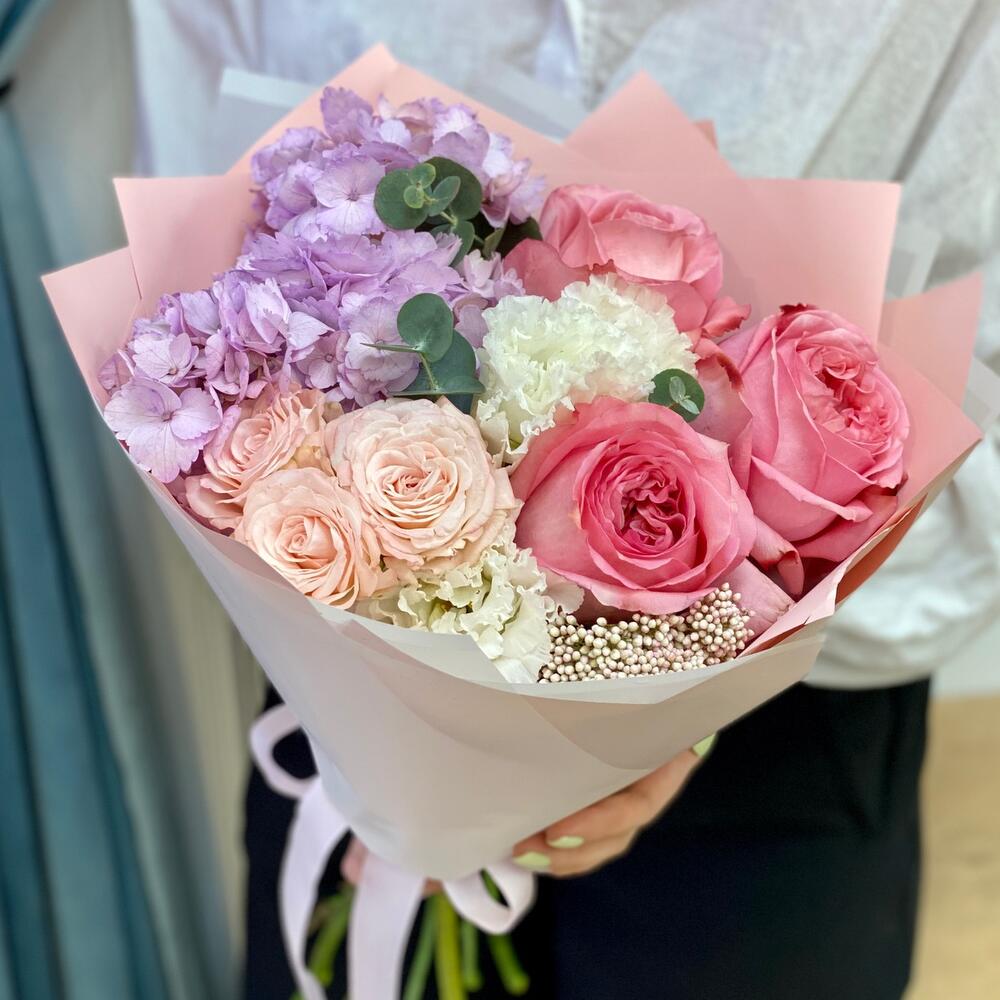 Гортензия – 1 шт.Озотамнус – 1 шт.Кустовая пионовидная роза – 1 шт.Пленка матовая – 2 шт.эустома белая – 1 шт.роза пинк экспрешн – 3 шт.эвкалипт 50 – 3 шт.
