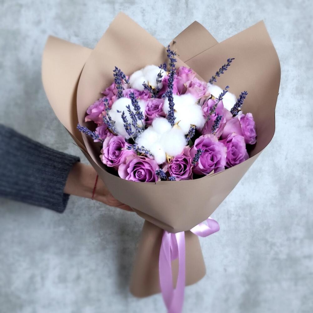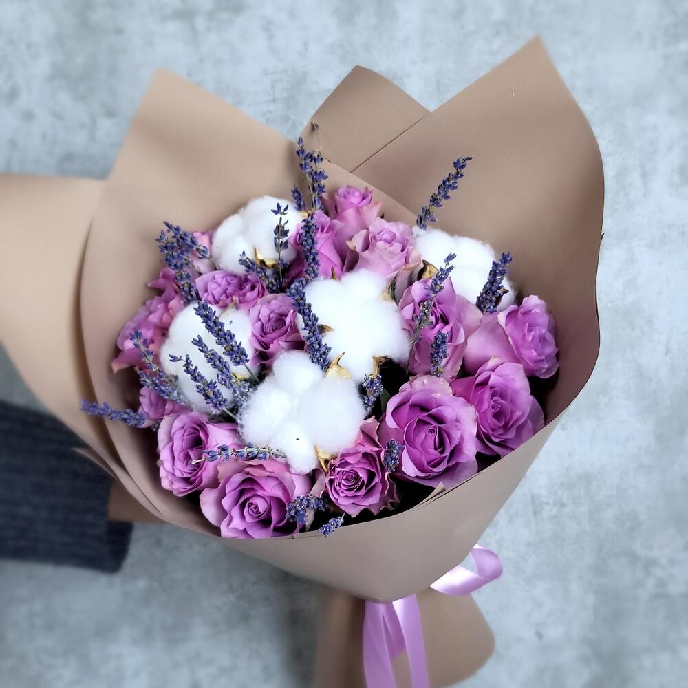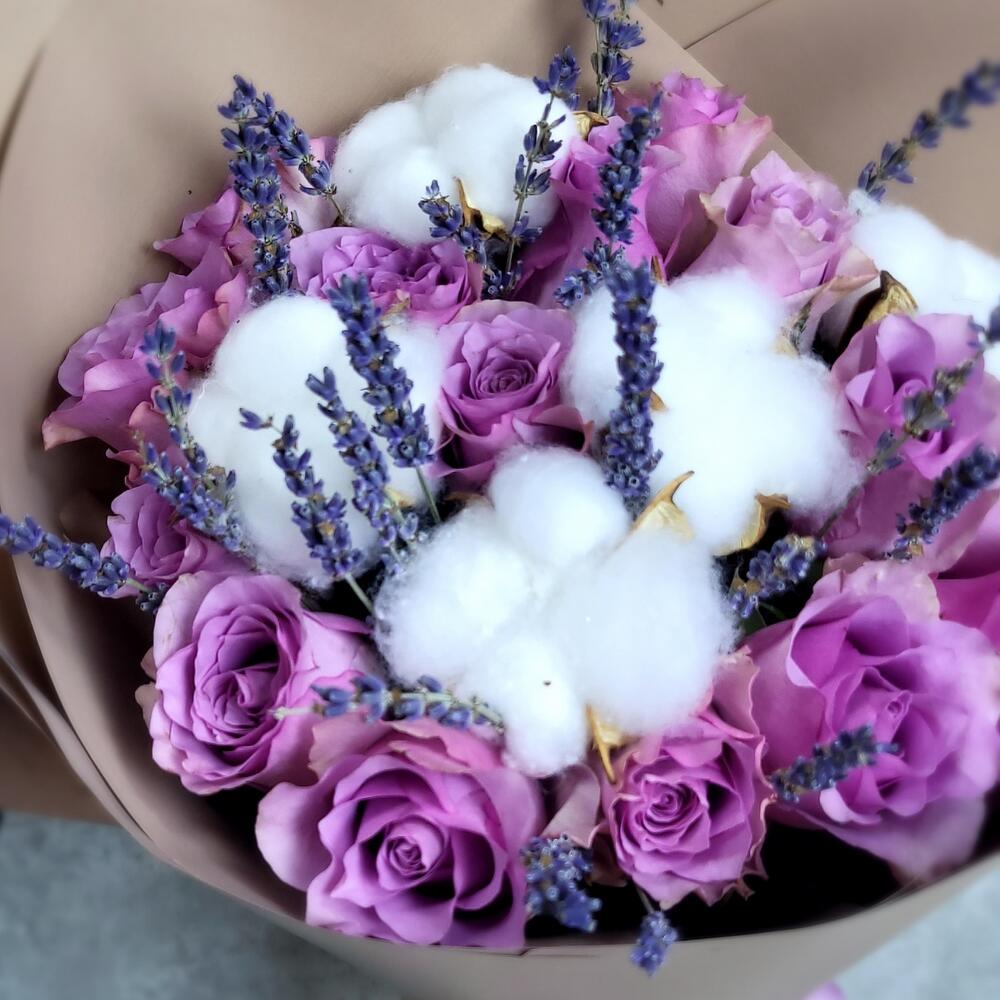 Лаванда – 25 шт.Хлопок – 5 шт.Роза Кенийская – 15 шт.Упаковка дизайнерская – 1 шт.