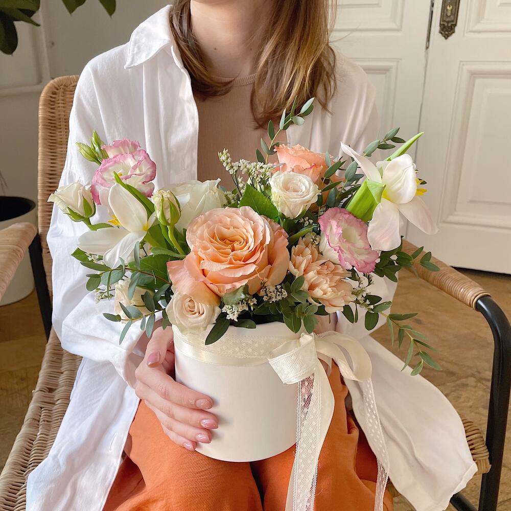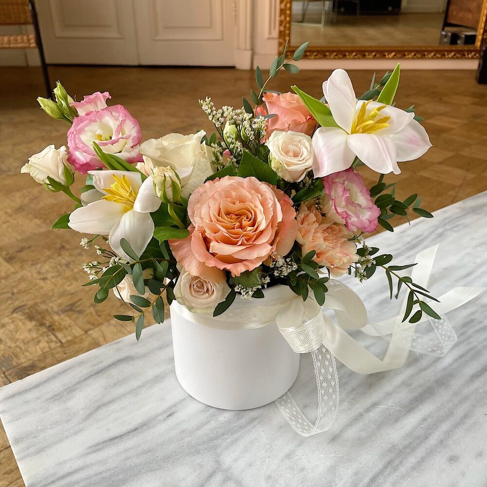 Роза персиковая – 2 шт.Роза кустовая кремовая – 1 шт.Лизиантус – 1 шт.Тюльпан – 2 шт.Эвкалипт – 1 шт.Лимониум – 1 шт.Коробка шляпная – 1 шт.Губка флористическая – 1 шт.