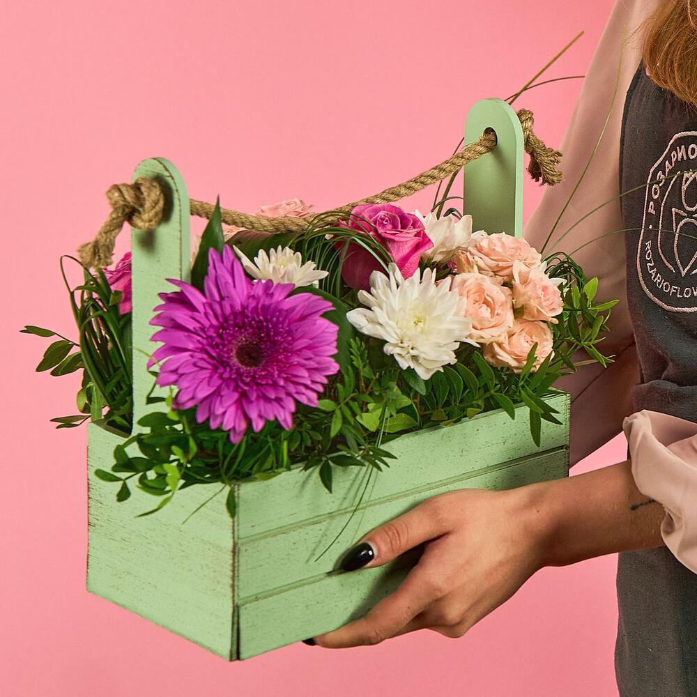 Аспидистра – 1 шт.Роза кустовая – 2 шт.Хризантема кустовая – 1 шт.Роза одноголовая – 3 шт.Берграсс – 1 шт.Гербера – 1 шт.Фисташка – 1 шт.Ящик деревянный – 1 шт.кирпич oasis классик – 1 шт.