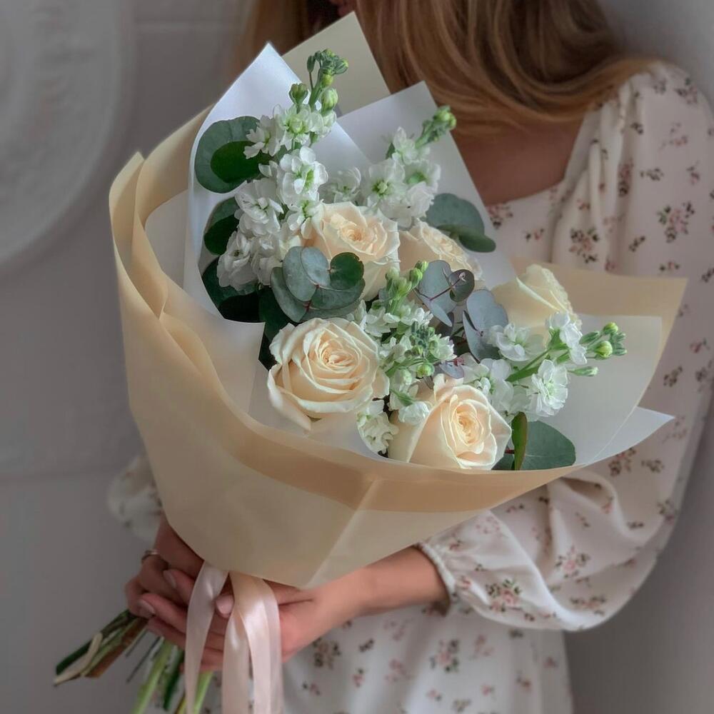 Маттиола белая – 4 шт.роза плая бланка – 5 шт.Эвкалипт Микс – 2 шт.Упаковка дизайнерская – 1 шт.
