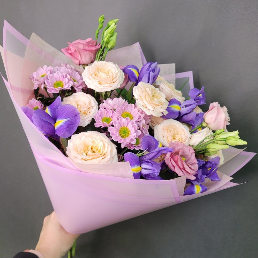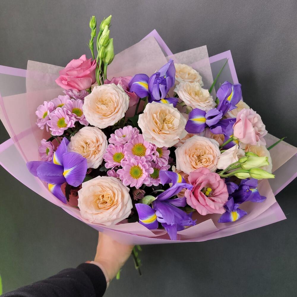 Роза кустовая – 2 шт.Ирис Blue Magic – 5 шт.Эустома – 2 шт.Сантини – 2 шт.Упаковка дизайнерская – 1 шт.Лента атласная – 1 шт.