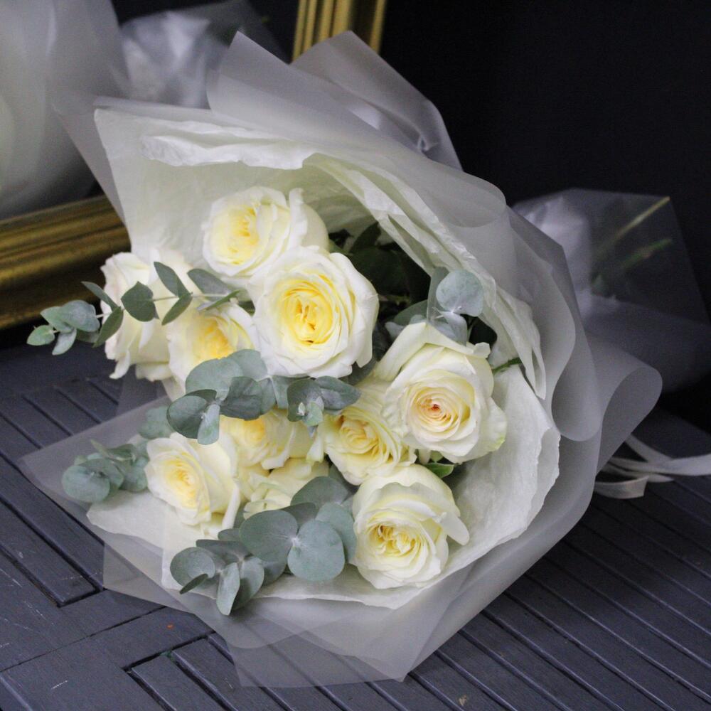 mono bouquet 143 из 11 пионовидных роз сорта candleligth с эвкалиптом