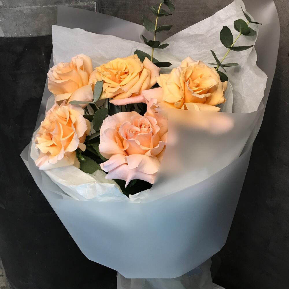 Лента – 1 шт.Эвкалипт – 2 шт.Тишью – 2 шт.Французская роза – 5 шт.Пленка матовая – 1 шт.Средство для продления жизни цветов – 1 шт.