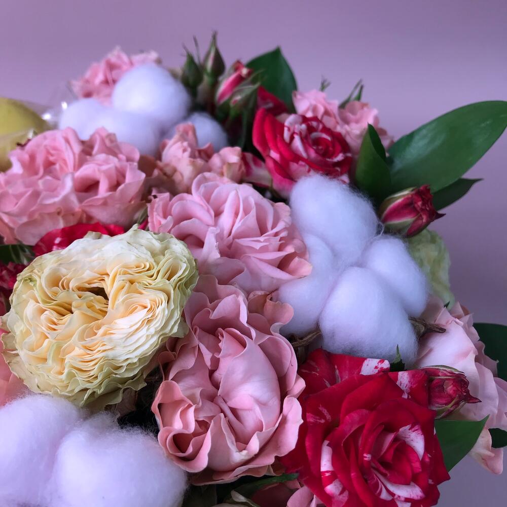 роза кустовая кружевная – 5 шт.Хлопок – 3 шт.Лента атласная – 1 шт.Тишью – 1 шт.Шляпная коробка – 1 шт.Оазис флористический – 1 шт.макарон (пирожное) – 4 шт.Рускус – 3 шт.