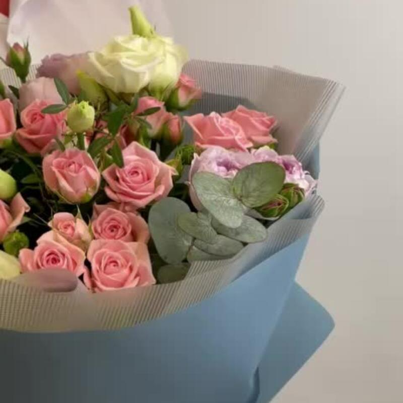 Кустовая роза – 2 шт.Эустома – 2 шт.Фисташка – 1 шт.Упаковка дизайнерская – 2 шт.Райсфлауэр – 1 шт.Эвкалипт Baby Blue – 1 шт.Кустовая роза пионовидная – 3 шт.