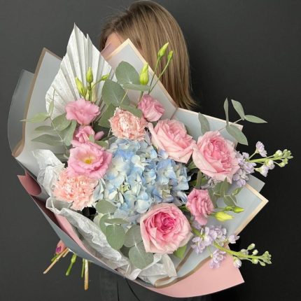 Дельфиниум – 9 шт.Лизиантус – 11 шт.Диантус – 15 шт.Роза пионовидная – 7 шт.Твидия – 5 шт.Эвкалипт – 9 шт.Фисташка – 4 шт.Лента атласная – 3 шт.