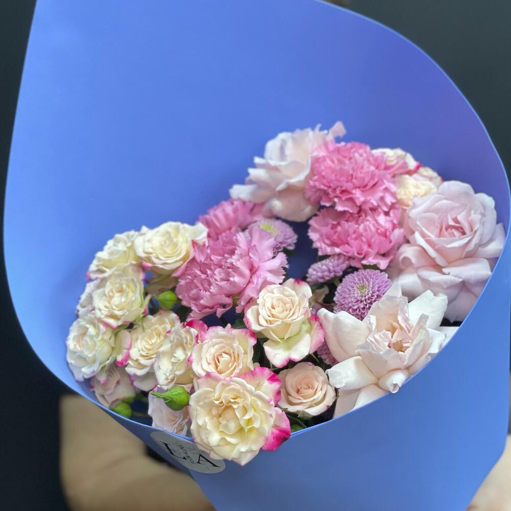 Кустовая роза – 3 шт.Роза Эквадор – 3 шт.Гвоздика – 4 шт.Лента атласная – 2 шт.Сантини – 2 шт.Фоамиран (упаковка) – 1 шт.