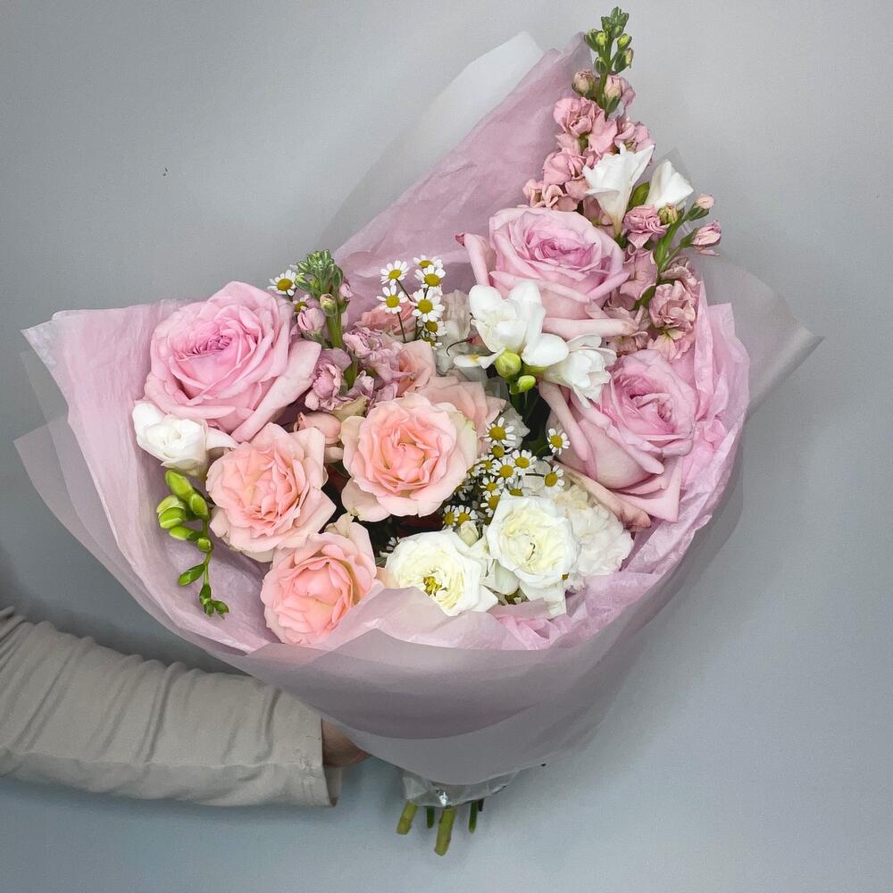 Маттиола – 3 шт.Фрезия – 3 шт.Кустовая роза – 4 шт.Диантус – 3 шт.Матрикария – 3 шт.Упаковка дизайнерская – 1 шт.Инструкция по уходу – 1 шт.пионовидная роза pink o’hara – 3 шт.подкормка для цветов – 1 шт.записка с вашим текстом – 1 шт.медиант ручной работы из бельгийского шоколада – 1 шт.
