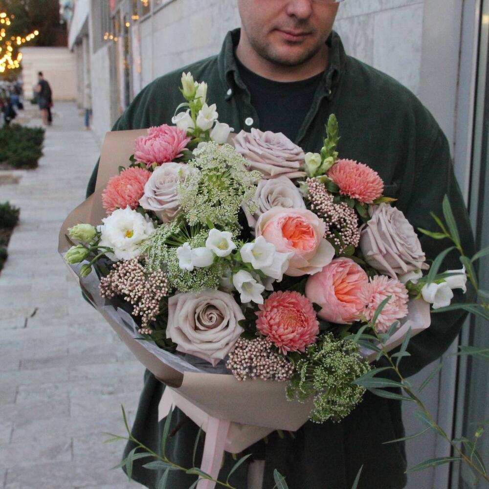 Авторский букет с английскими розами, зонтиками, колокольчиками, астрами и озотамнусом.Стильное цветочное решение для любого случая.