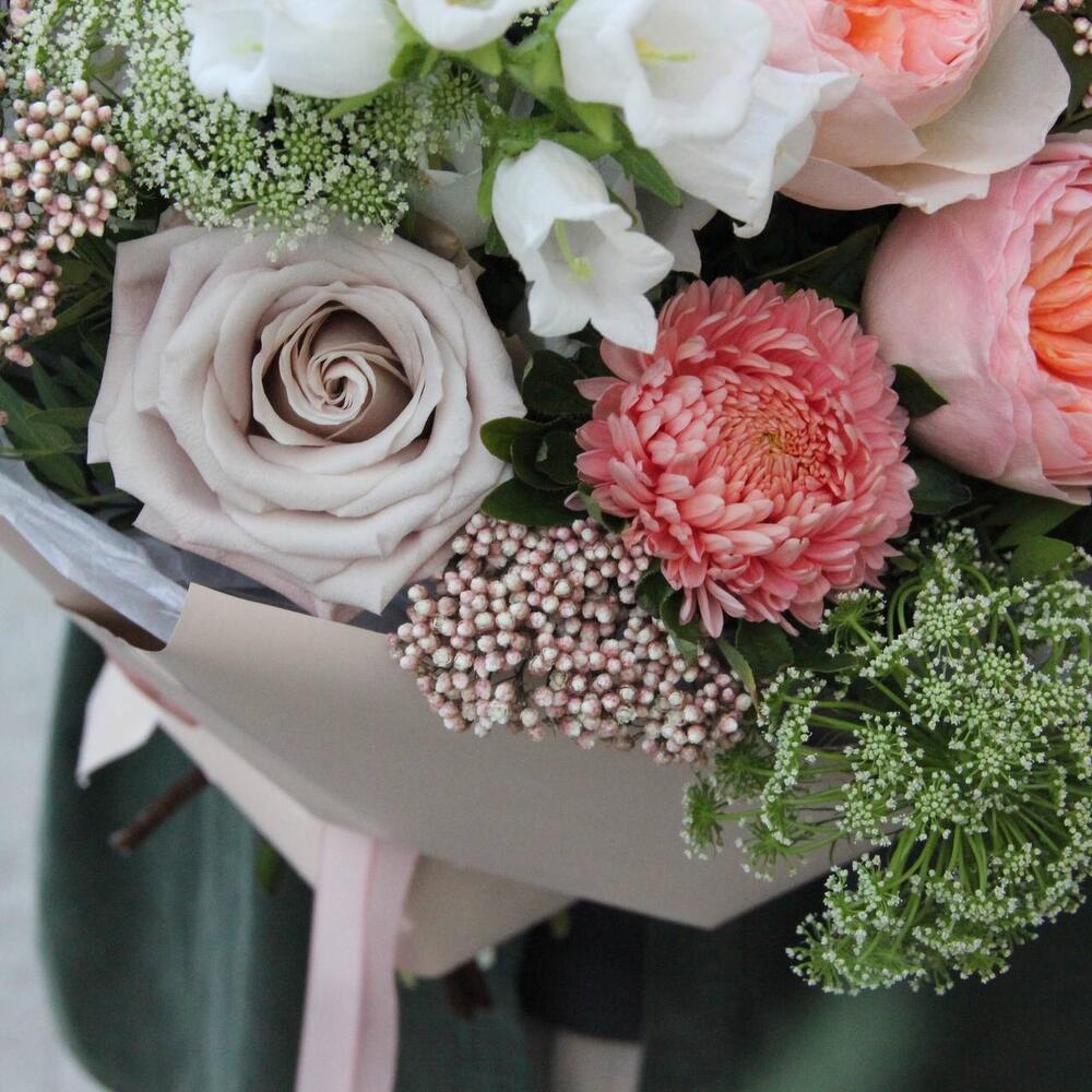 Роза пионовидная – 2 шт.Роза Мента – 3 шт.Астра – 4 шт.Озотамнус – 3 шт.Амми – 3 шт.Львиный зев – 1 шт.Колокольчик – 3 шт.Лизиантус – 1 шт.Фисташка – 3 шт.Упаковка – 1 шт.Лента – 1 шт.