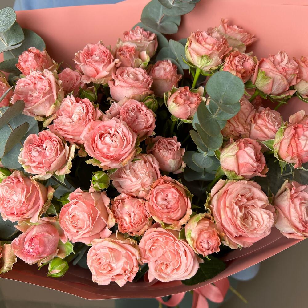 Эвкалипт – 3 шт.Упаковка дизайнерская – 1 шт.Пионовидная кустовая роза – 9 шт.комплимент от polyanka – 1 шт.