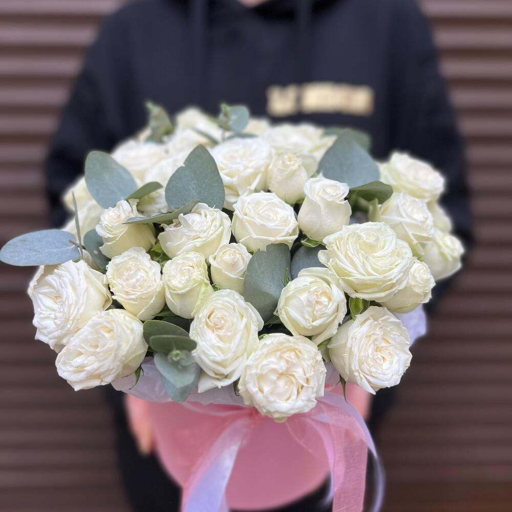Пион розы с эвкалиптом в коробке (К 003)