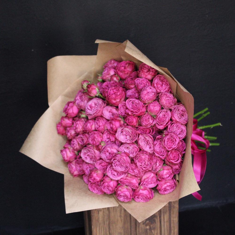 Пионовидная кустовая роза – 21 шт.Крафт упаковка – 2 шт.Лента атласная – 2 шт.